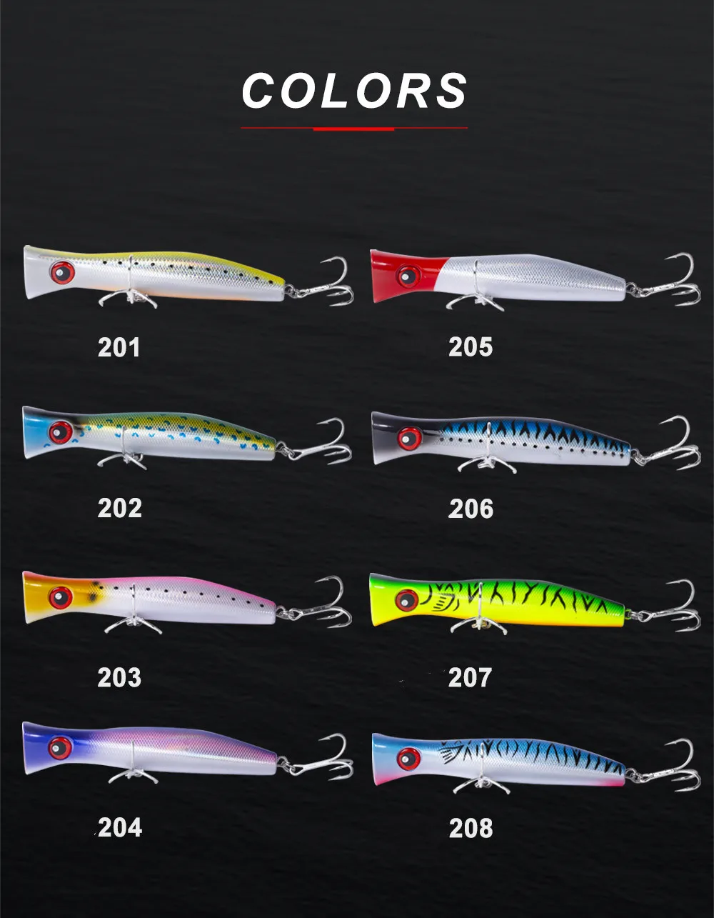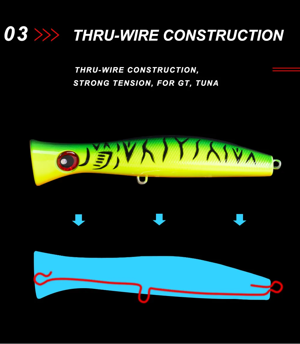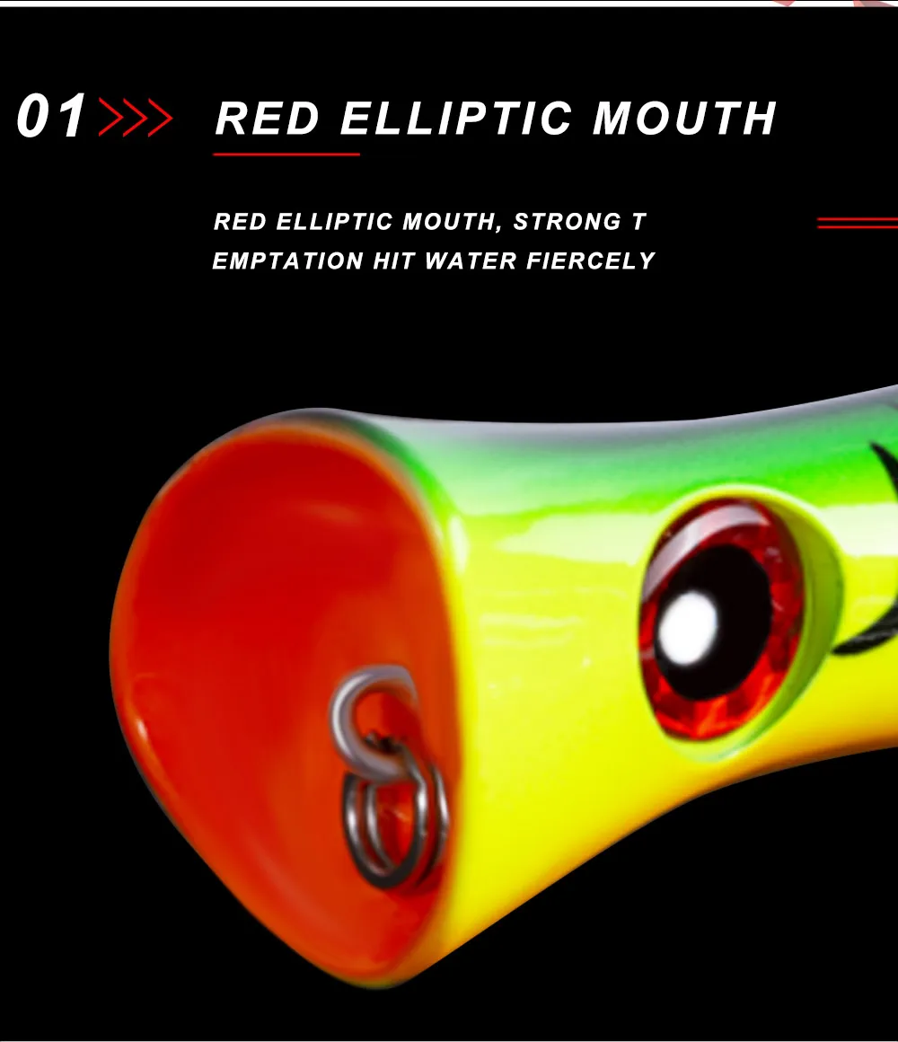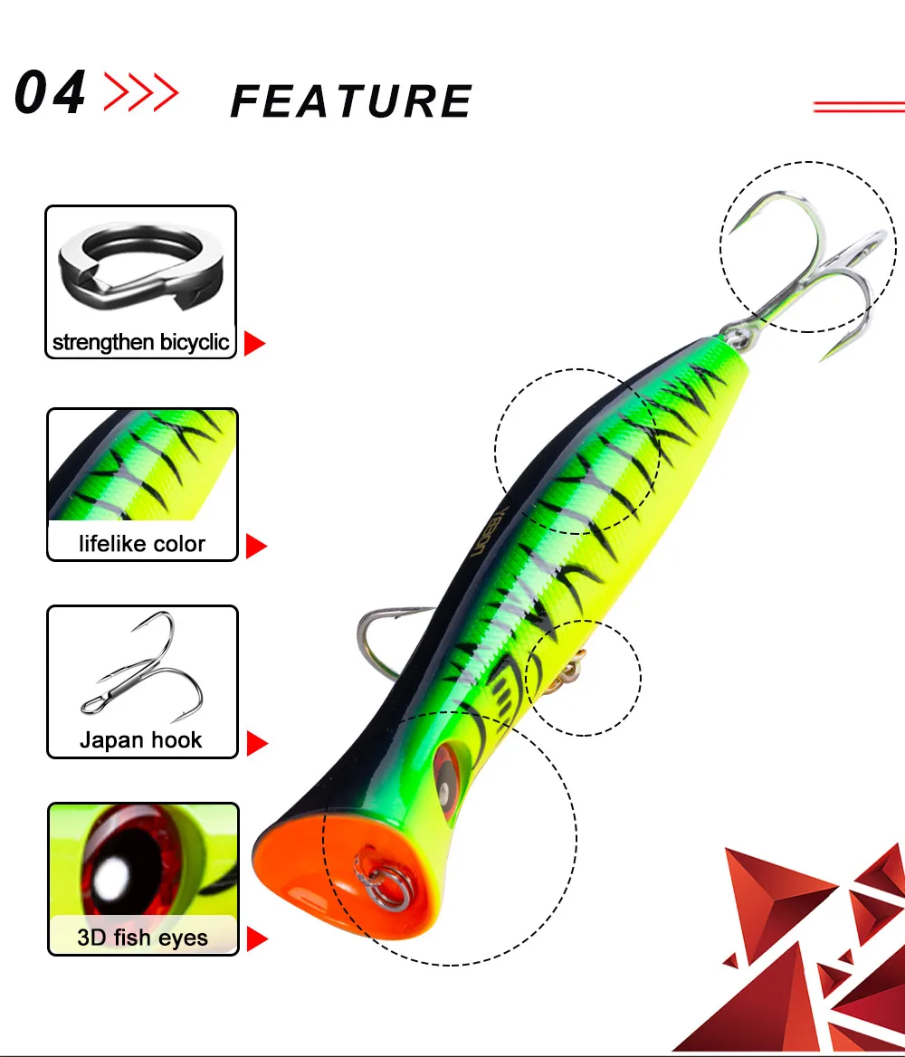 Спецификация: 1. Тип: верхняя жесткая приманка 2. Цвет: 8 цветов, как показано на фотографии 3. Глаза: 3 дюйма 4. Вес: 115,2 г/3,7 унций 5. Длина: 200 мм/7,8'' 6. Крючок: сильный тройной VMC крюк 7. Лазерный Аппарат 8. Действие: верхняя вода