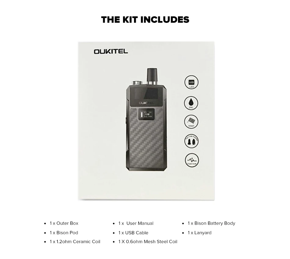 1 x внешняя коробка 1 x Руководство пользователя Аккумулятор Bison-1 шт. 1 х Bison Pod 1 х USB кабель 1 x ремешок 1 х 1,2 Ом керамическая катушка 1 х 0.6ohm сетка стальная катушка