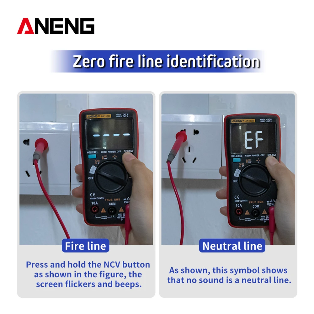- Measurement functions include AC/DC voltage, AC/DC current, resistance, diode test/continuity, NCV, frequency/duty cycle, capacitance.