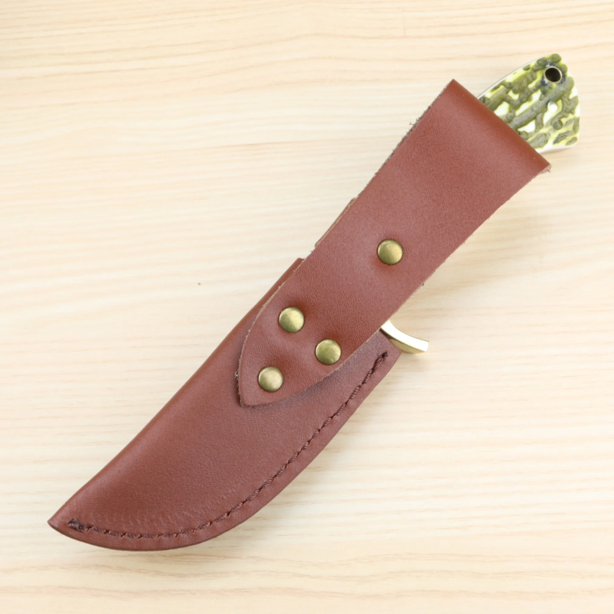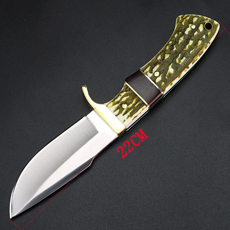 Полная длина: 20 см Длина лезвия: 9,0 см толщина лезвия: 0,5 мм лезвие: 5C17 высококачественная нержавеющая сталь твердость: 57 Ручка: чистая медь + рога + красное дерево тени