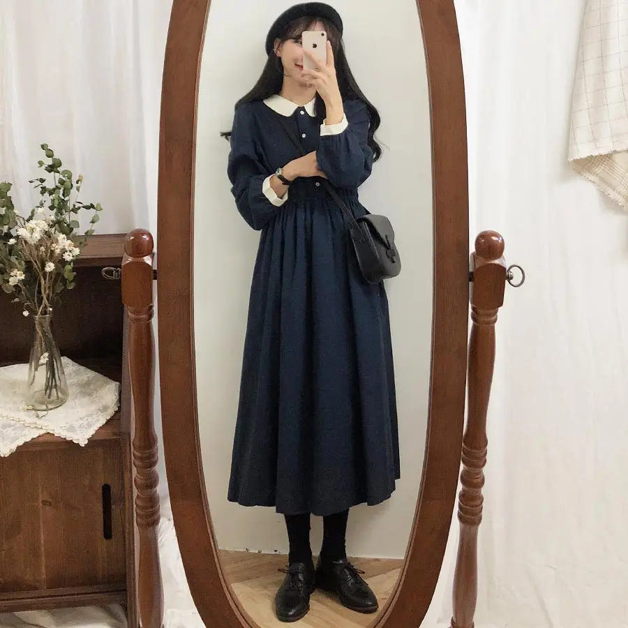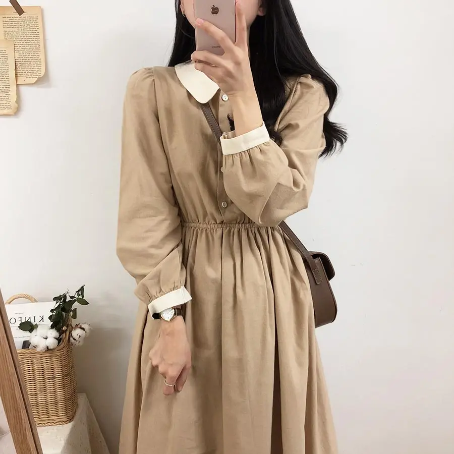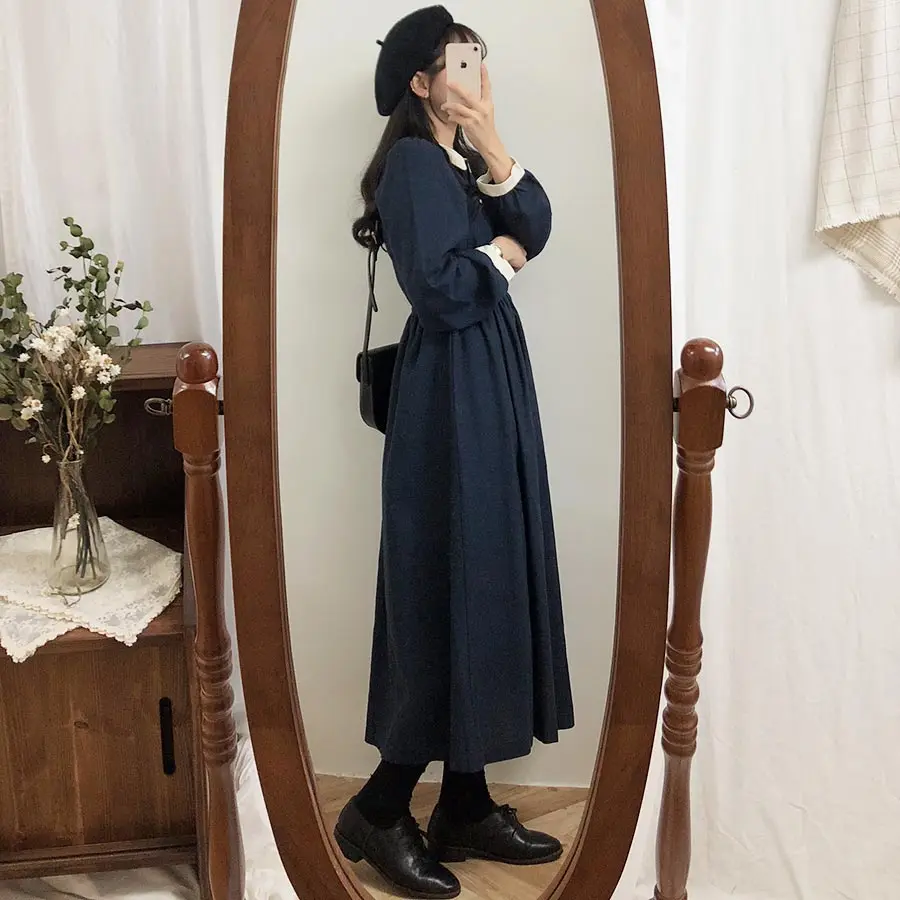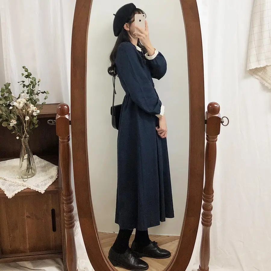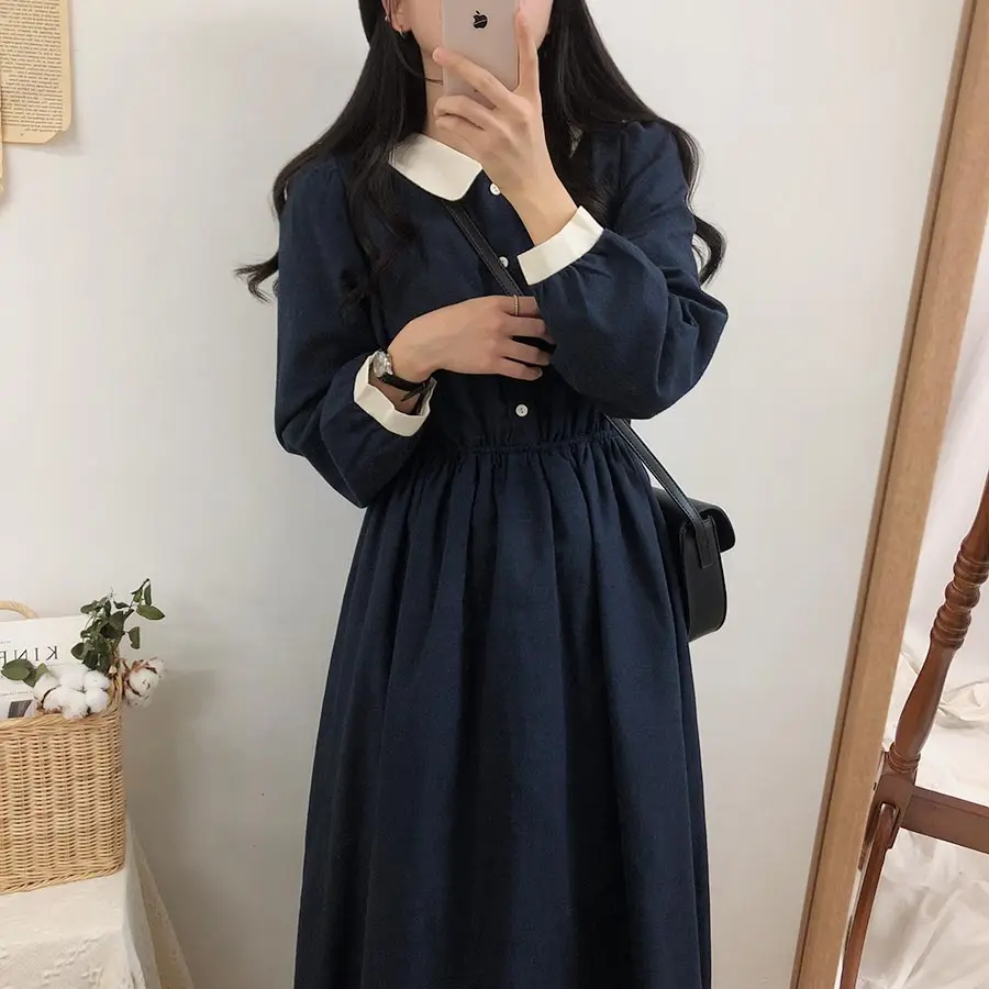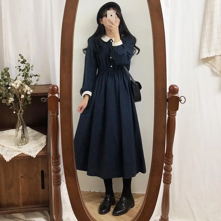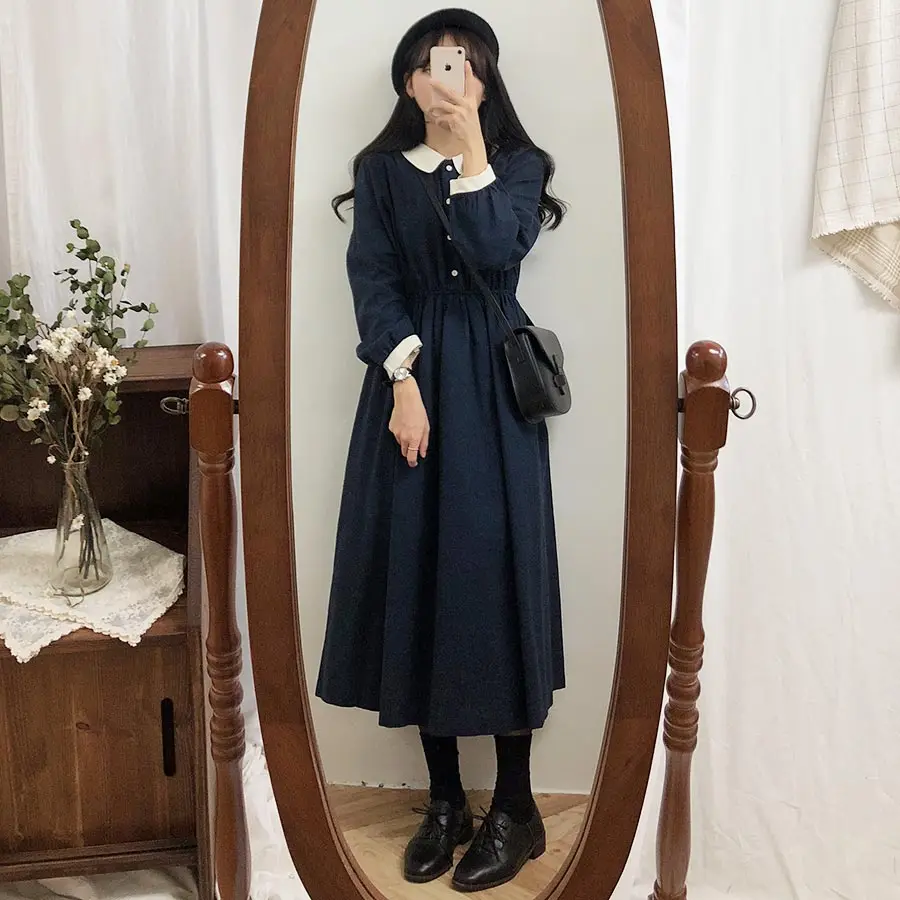 Зимние Базовые платья, длинные, Лидер продаж, корейский японский стиль, женское милое платье с длинным рукавом для девушек в стиле преппи с белым воротником, ТРАПЕЦИЕВИДНОЕ винтажное платье