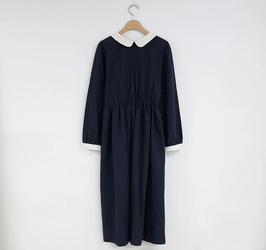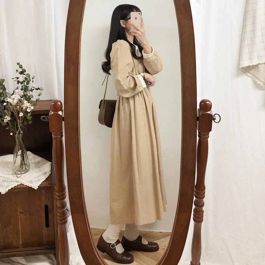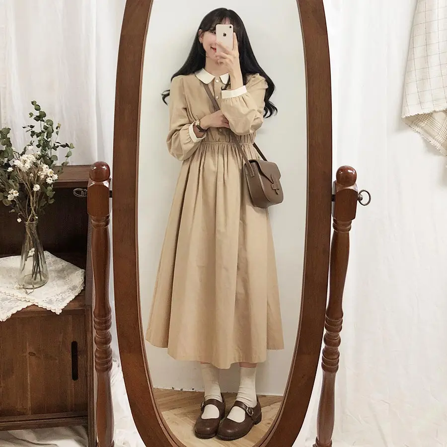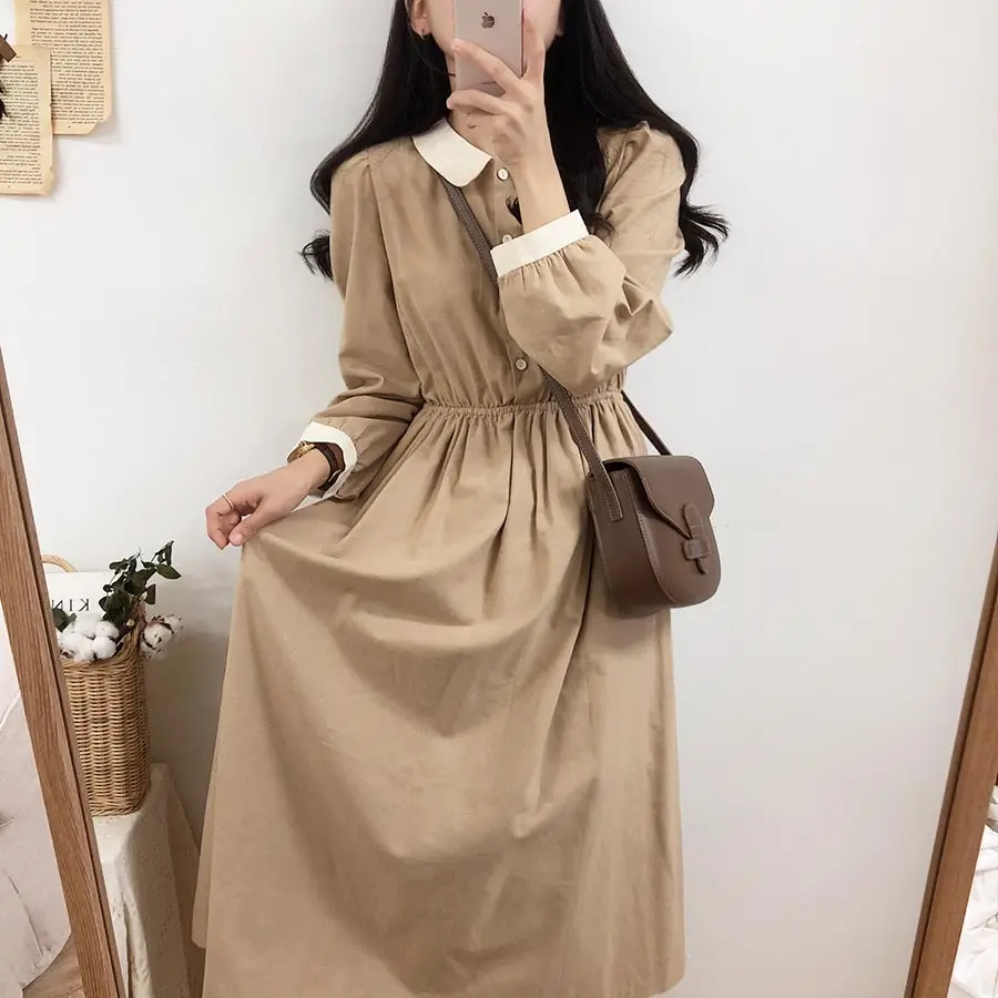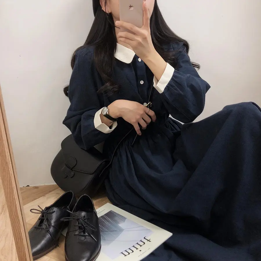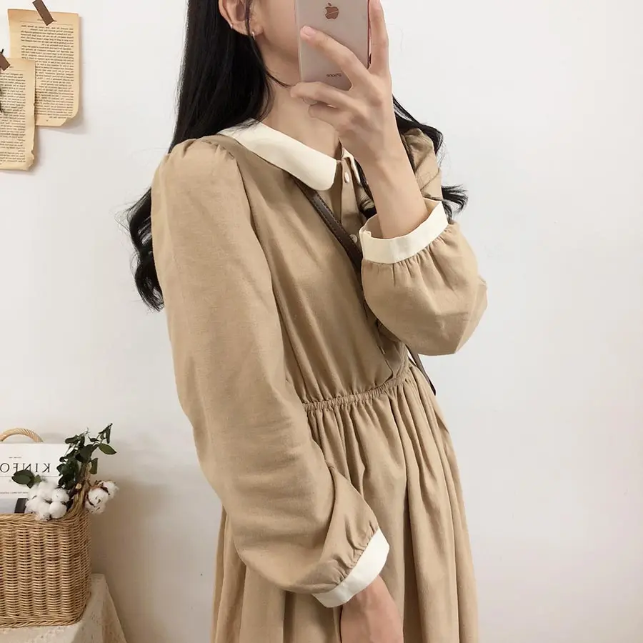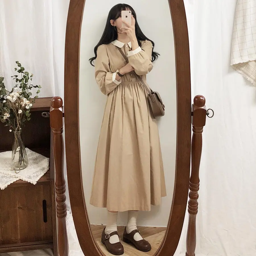Зимние Базовые платья, длинные, Лидер продаж, корейский японский стиль, женское милое платье с длинным рукавом для девушек в стиле преппи с белым воротником, ТРАПЕЦИЕВИДНОЕ винтажное платье