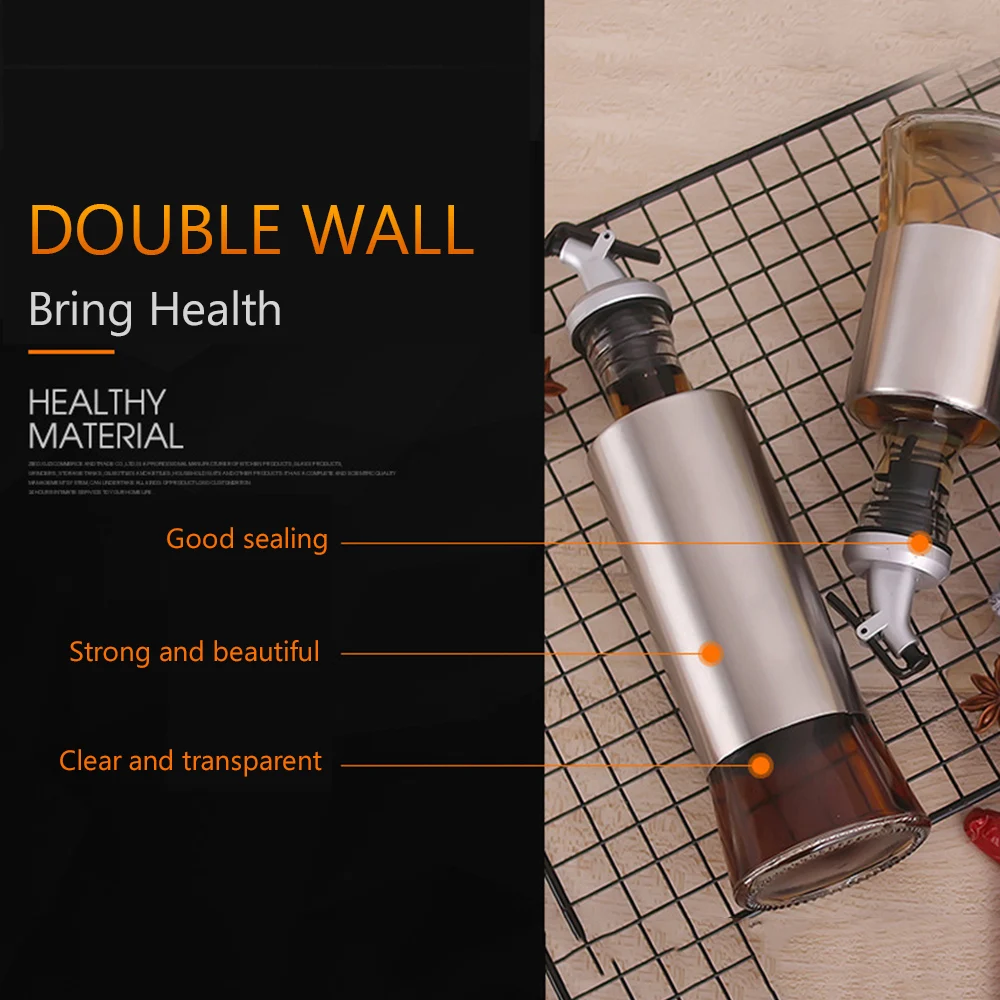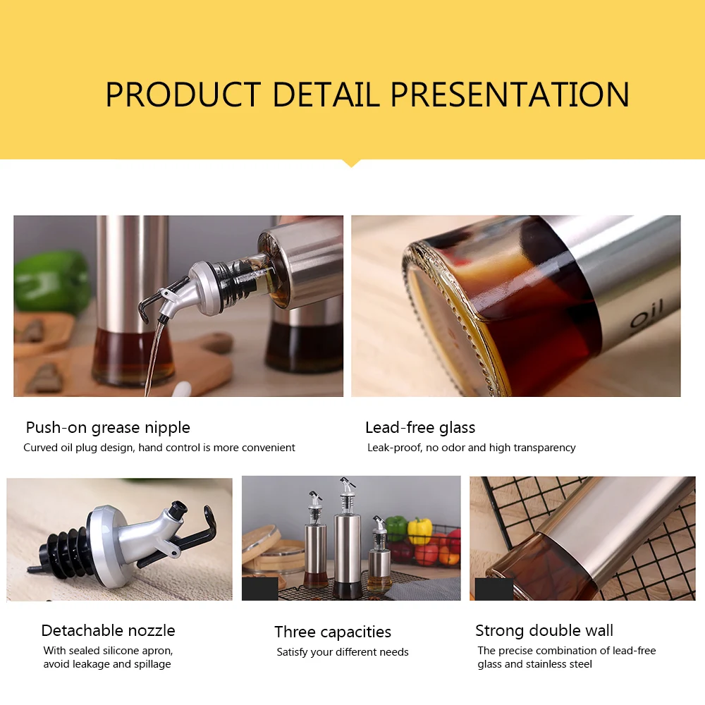 Прозрачное дно бутылки и рот бутылки, вы можете видеть и контролировать объем масла четко, нескользящий корпус бутылки из нержавеющей стали и бессвинцовый стеклянный материал, обеспечить здоровье вашей семьи