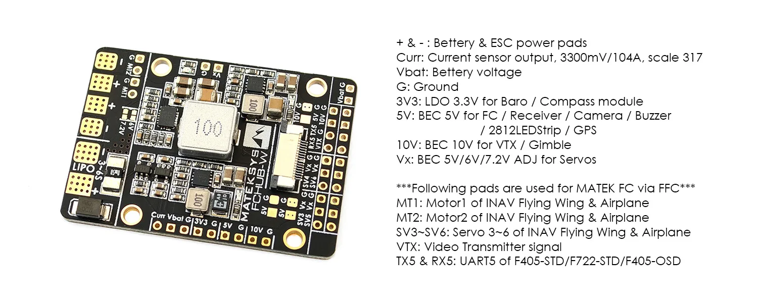 MATEK Высокое качество специальный дистрибьютор для фиксированного крыла. Многофункциональный и уникальный интерфейс различного оборудования, подходит для аэрофотосъемки с фиксированным крылом. Бортовой гальванометр может отправить обратно рабочее состояние батареи через управление полетом. Поддержка двойного фиксированного крыла, двойной электрический интерфейс. Различные BEC стабилизированный выход, подходит для внешней аэрофотосъемки оборудования. Расположение интерфейса является разумным и простым в установке. ■ Название продукта: MATEK fchub-W ■ Технические характеристики изделия: Размер: 52*36*6 мм Расстояние между монтажными отверстиями: 30,5*30,5 мм Вес: 13 г Входное напряжение: 9-30 в (3-6S LIPO) BEC выход: 5V2A/10V2A max-3a Гальванометр: 104A масштаб 317