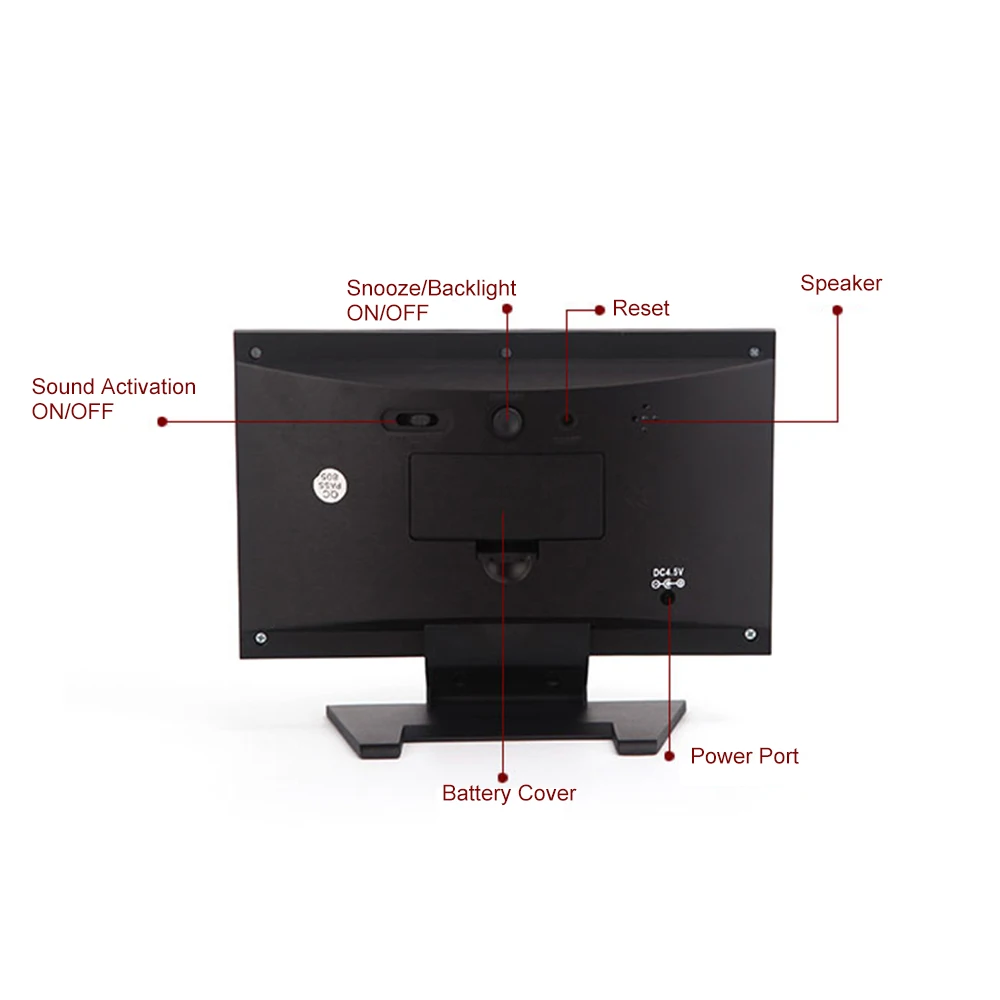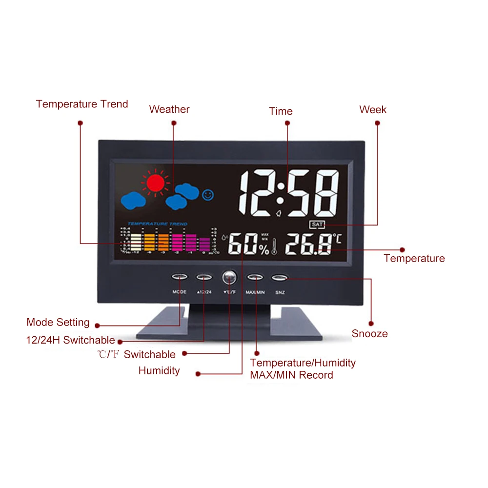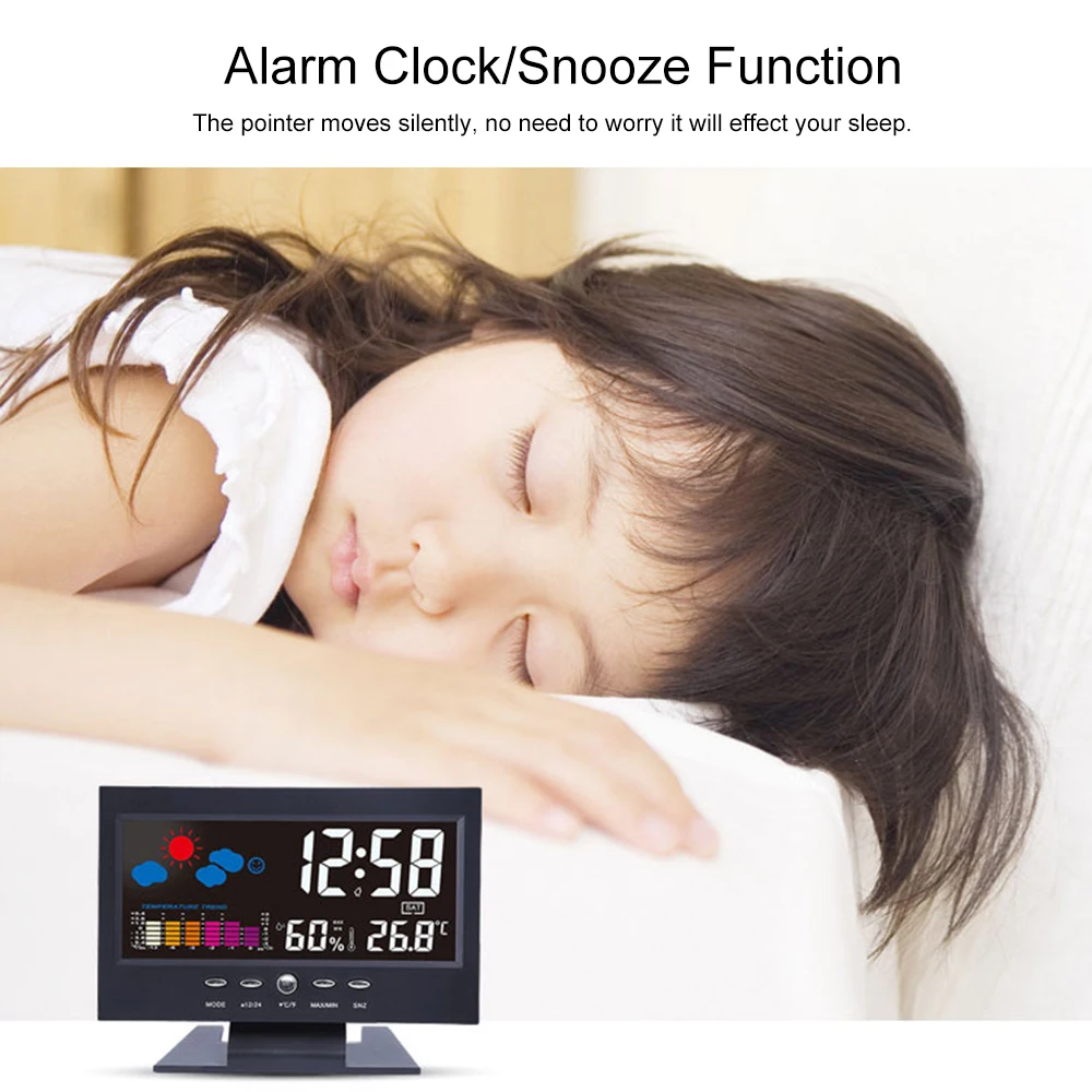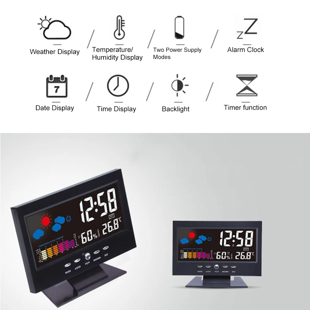 Многофункциональный ЖК-будильник с дисплеем времени/даты/Недели/температуры/влажности/погоды, идеально подходит для домашнего и офисного использования. И это с подсветкой дисплея, вы можете легко читать значение в ночное время.