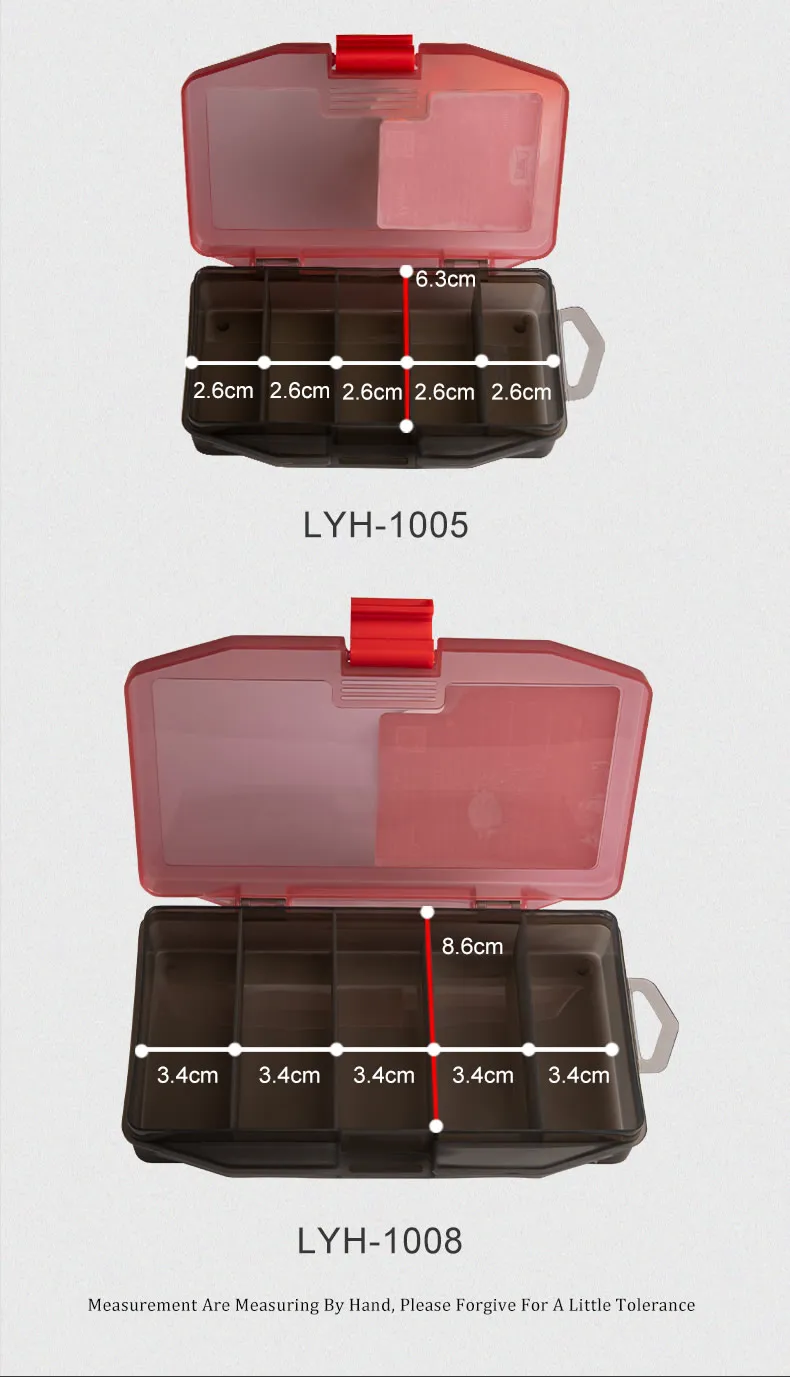 ● Размер: LYH1005(13*6,5*2,8 см); LYH1008 (17,3*9*2,8 см) ● Цвет: черный/красный; Красный/черный ● Материал: полипропилен, прочный и прочный. ● Дизайн: толстая конструкция, однослойная конструкция, дренаж и влага ● Обратите внимание: цена указана только за коробку для рыболовных снастей, не включая приманки, покажите для вашей справки емкость для хранения.