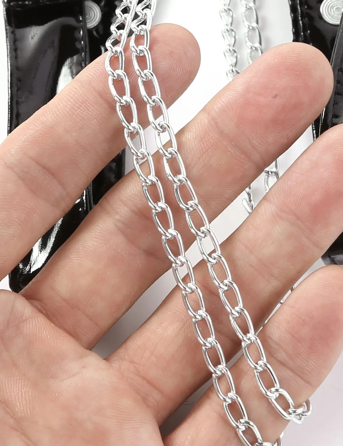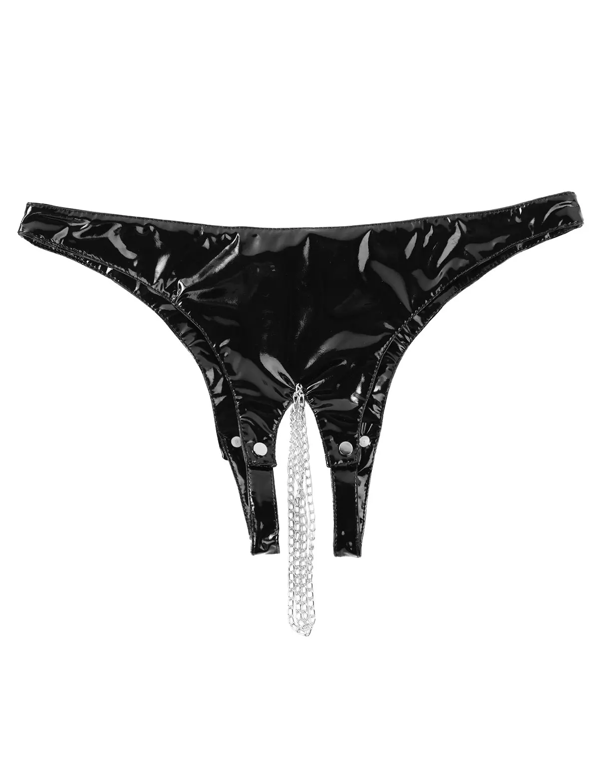 Дизайн с низким подъемом и открытой промежностью, с металлическими цепочками от центрального переднего уплотнительного кольца до задней части.