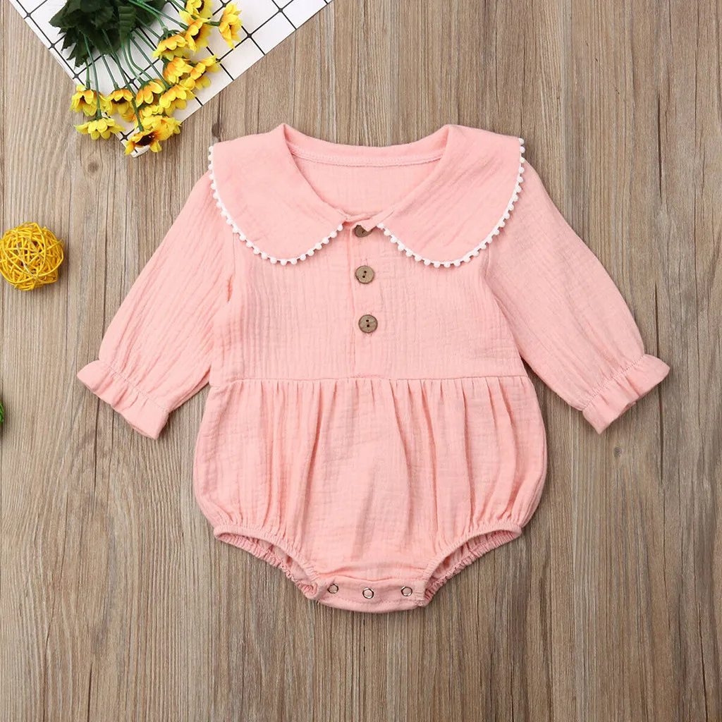 Infant Newborn Baby Girls Doll Collar Solid Ruched Romper Bodysuit Clothes
