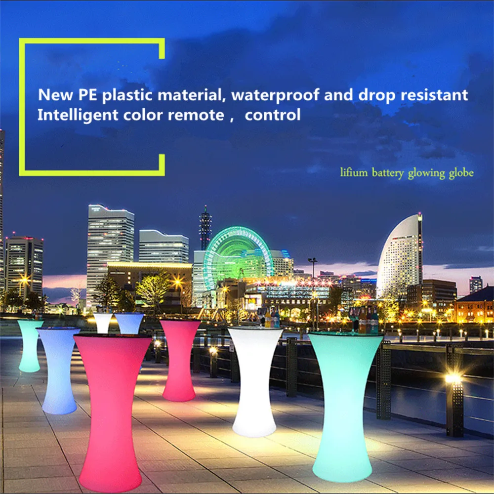 Product Name: cocktail table(movable / waterproof) Product material: PE (polyethylene) Product Size: 45xH110cm 38xH83cm 48xH83cm 56xH105cm 60xH110cm 59xH110cm Product color: natural color (milk white) Product voltage range: 100-240V Product DC voltage: 5V1A Product features: RGB+W (16 monochrome selection, 4 conversion modes) 1. With remote control and switch control 2. Rechargeable lithium battery (2000MAh) DC: 5V1A 3. Charging / use time: 4-6hrs / 8-10hrs Product packing list: 1Piece Applicable venue: beachfront / restaurant / bar / KTV / courtyard / garden / swimming pool / wedding scene / large release site decoration.