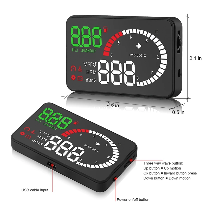 6. Автоматическое включение и выключение с запуском и выключением транспортного средства, эффективная защита автомобильного аккумулятора; Сохраняя режим ручного переключения, и более легко управлять HUD. 7. Автоматический и ручной режим регулировки яркости, вождение без бликов. 1. Интерфейс OBDII, чтобы связаться с интерфейсом OBD транспортного средства. 2. Кнопка для включения и выключения питания. 3. Волновая кнопка: кнопка вверх (поворот кнопки вверх),OK кнопка (нажатие кнопки вертикально), кнопка вниз (поворот кнопки вниз)