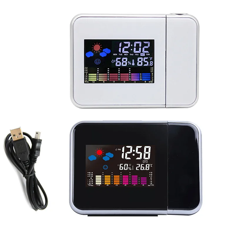 1.Все-в-одном функции----- Беспроводной проекционный будильник с дисплеем температуры и влажности в помещении; Проекция температуры и времени с кнопкой включения или выключения; 1 порт зарядного устройства USB; 2 функции будильника и повтора; календарь с 7 языками выбора; время в 12/24 часовой формат; 4-уровневая подсветка на выбор с блоком питания.