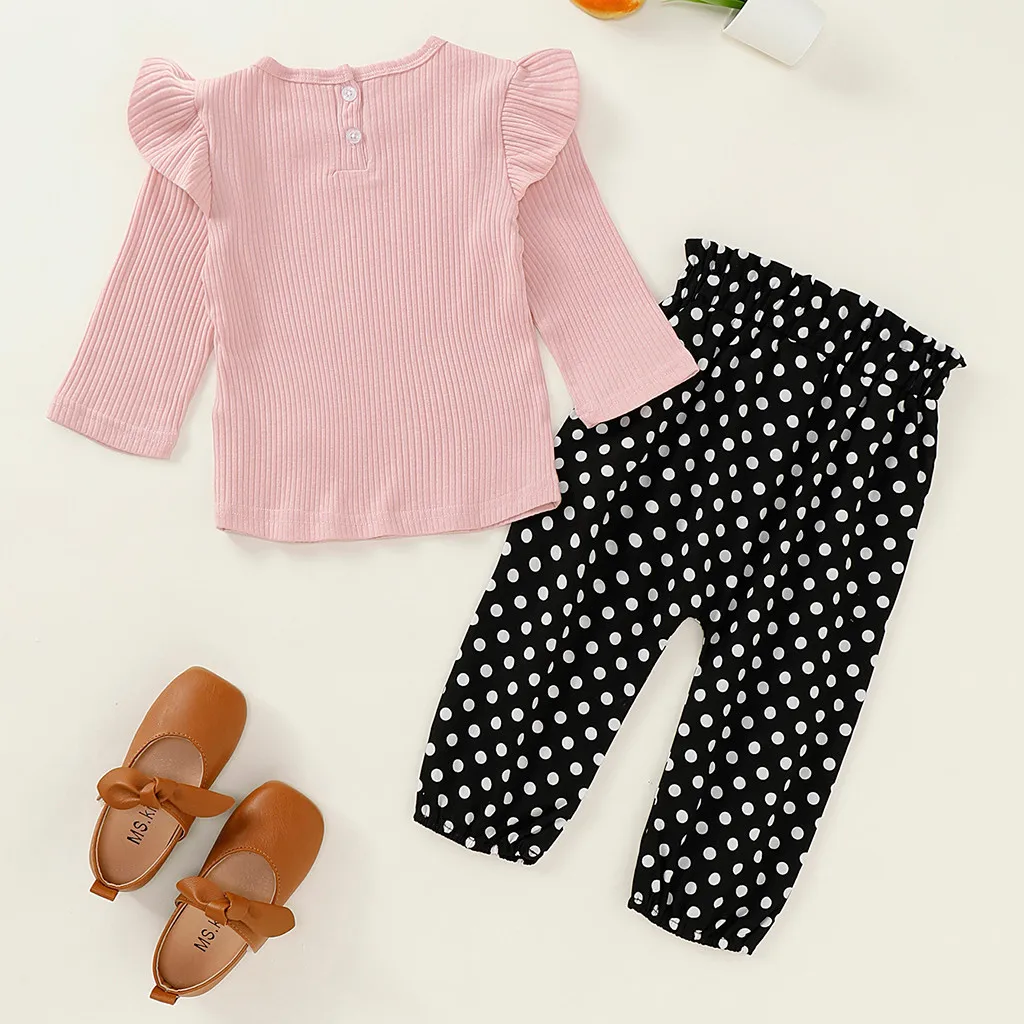 Однотонная футболка с длинными рукавами и оборками для маленьких девочек комплект одежды из топа и штанов в горошек