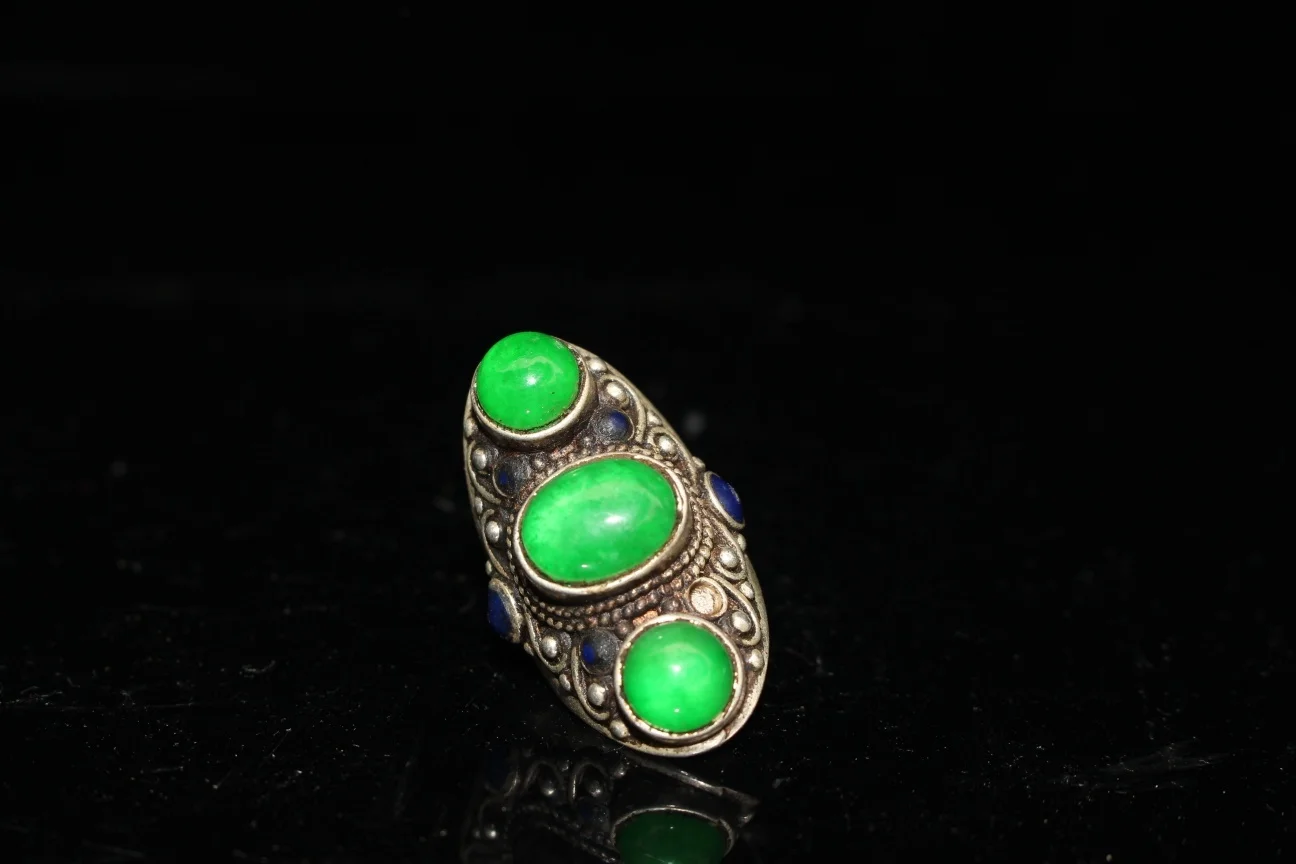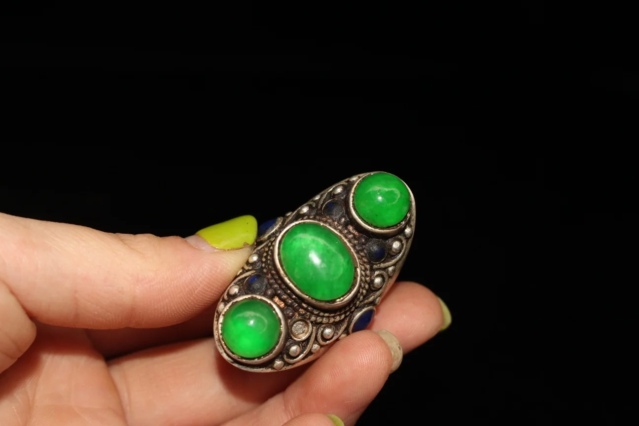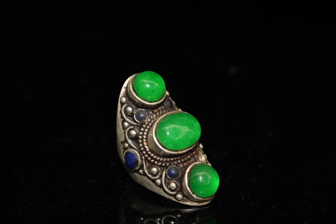 Тибетское и непальское народное старое тибетское серебряное инкрустированное зеленым камнем нефритовое кольцо