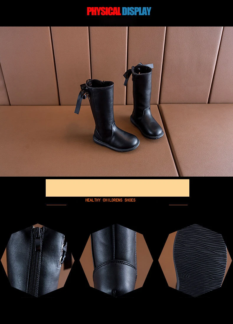 Зимние детские сапоги до колена; Обувь с бантом для маленьких девочек; Детские теплые сапоги принцессы; Черные сапоги из искусственной кожи для малышей; Модная брендовая обувь