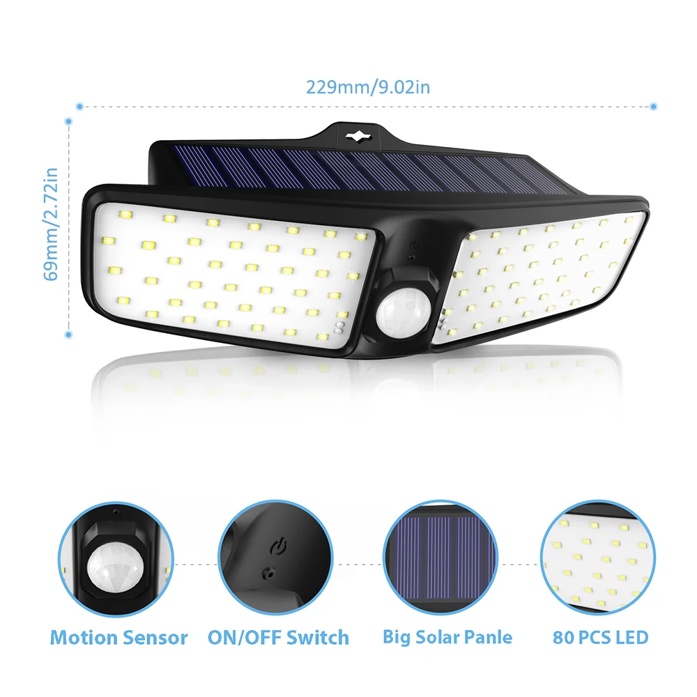 Уличный Солнечный садовый светильник, 80 светодиодов Солнечный Точечный светильник с датчиком движения с широким углом Светильник ing беспроводной настенный светильник IP65 Водонепроницаемый для гаража, патио, забора