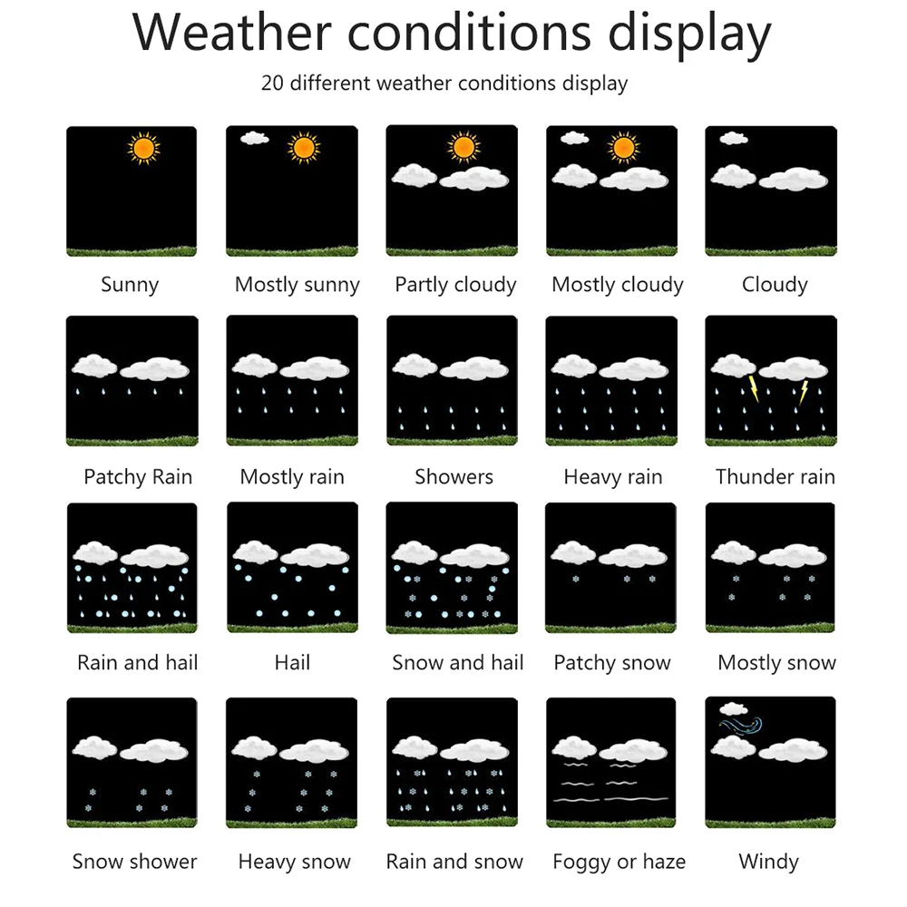 Сегодня и в течение следующих 4 дней прогноза погоды. Может отображать температуру в помещении/на улице и влажность (°C или °F), барометрическое давление, скорость ветра и оповещение о морозе.