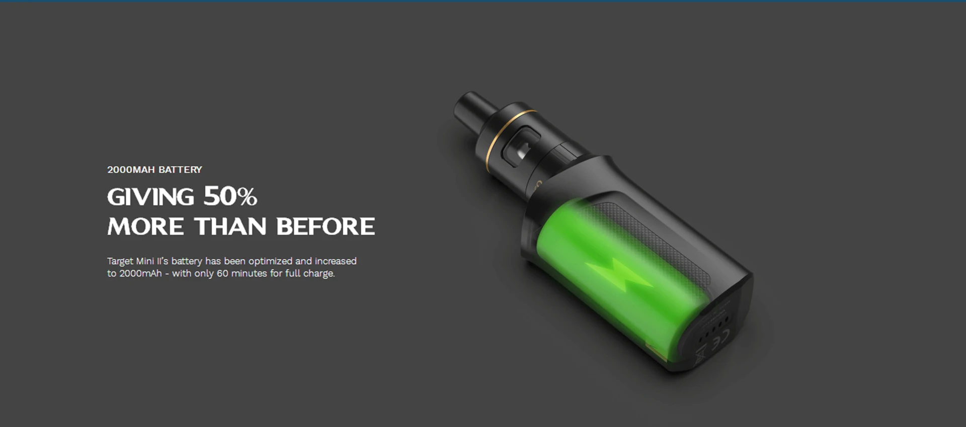 Устройство Target Mini II оснащено аккумулятором 2000 мА · ч, который работает на 50% дольше, чем оригинал Target Mini, и обеспечивает более насыщенные вкусы с баком VM. Емкость VM оптимизирована для катушек ccel и чайных волокон с сетчатыми катушками, чтобы доставить истинные вкусы из солей nic и электронных соков с бесплатным основанием.