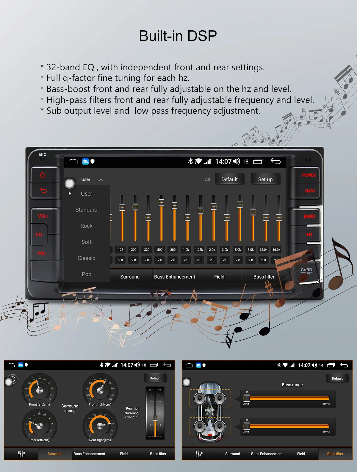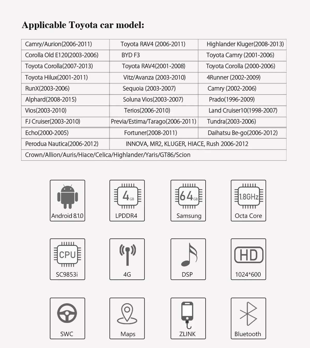 1. Android 8.1.0, Intel SC9853I 1,8 ГГц 4 + 64 ГБ, 7 дюймов 2 din HD 1024*600 HD экран для Toyota 2. Супер производительность оборудования, 4 Гб ОЗУ + 64 Гб ПЗУ Восьмиядерный 3. Интернет-развлечения, Встроенный 4G модуль и поддержка WiFi 4. Поддержка Google Play Store, вы можете скачать много приложений 5. Поддержка aftermarket камера заднего вида/DVR/OBD2/DAB +/TPMS, нужно покупать отдельно 6. Поддержка быстрой загрузки, сделать радио запускается быстро 7. Поддержка кнопок управления рулем OEC 8. Bluetooth для handfree, Синхронизация Bluetooth телефонной книги 9. Поддержка сети 3g/4G, делает радио доступ в Интернет легко 10. Поддержка Android auto, поддержка проводного подключения (через usb-кабель) 11. Поддержка беспроводной carplay, поддержка беспроводного подключения (через bluetooth) и проводного соединения (через usb-кабель) 12. Поддержка голосовых команд