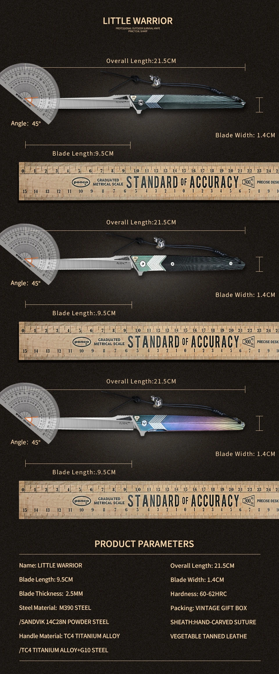 {Размер и материал} 1. 【Название: маленький воин-низкопрофильный легкий нож джентльмена 2.【Total length】: 21,5 см (8,5 дюймов) 3.【Blade length】: 9,6 см (3,8 дюймов) 4.【Blade width】: 1,4 см (0,5 дюймов) 5.【Blade толщина】: 2,5 мм (0,1 дюймов) 6. Вес: 63 г (2,2 унций) 7. 【Термическая обработка 】: вакуумная криогенная Термическая обработка 8.【Hardness】: 60-62HRC(M390) / 60-61HRC(14C28N) 9. 【Материал лезвия 】: австрийская сталь M390 (инкрустированное углеродное волокно)/Швеция Sandvik 14C28N сталь (инкрустированное углеродное волокно) 10. 【Материал ручки 】: Версия M390: титановый сплав (зеленый) 14C28N версия: G10 (черный) + титановый сплав 11. 【Материал оболочки 】: ручная сшитая кожа растительного дубления оболочка для пояса 12. 【Упаковка 】: подарочная коробка {Введение} 1. Общая длина 8,5 дюйма/вес 2,2 oz Флиппер складной нож использует быстро и легко одной рукой. 2. 3,8 дюймов в японском стиле танто Точка M390 сталь/14C28N стальное лезвие, sharp и прочный. Это изысканный карманный нож самурая в японском стиле. 3. 4,7 дюймов зеленый titanium сплав/черный G10 ручки сделаны с винтажный стиль, с радиальным узор, изысканный и нескользящая. 4. Зеленая/черная кожаная оболочка для ремня. Он изготовлен из растительного дубления кожи. Вы можете повесить его на ремень или рюкзак. 5. Подходит для ежедневной переноски или кемпинга, пеших прогулок, рыбалки и других видов активного отдыха. Это идеальный подарок для джентльменов или любителей ножей.