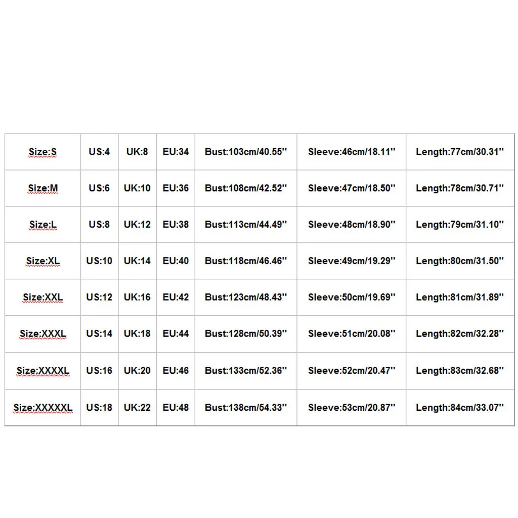 | Размер | США | Великобритания | ЕС | Бюст | Рукав | Длина |