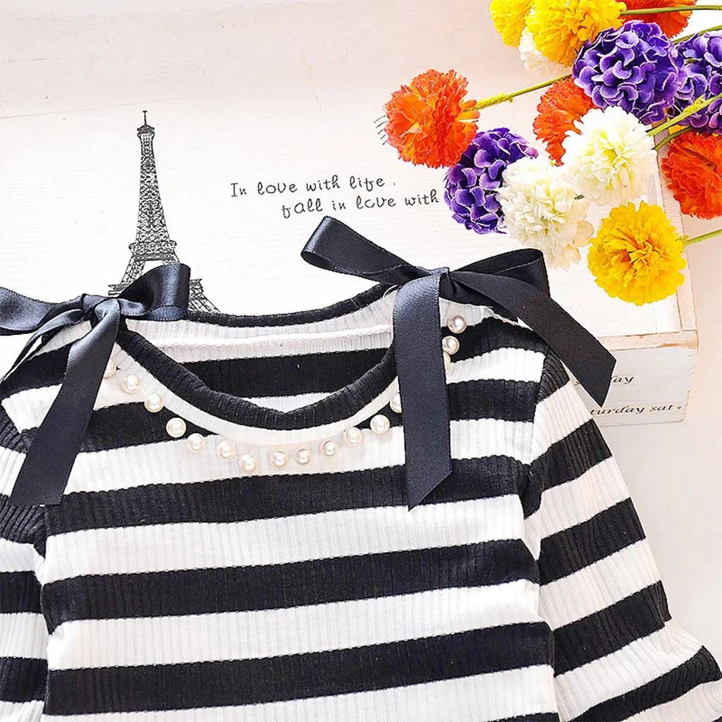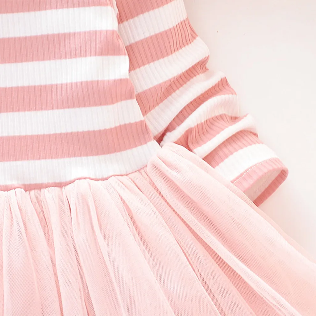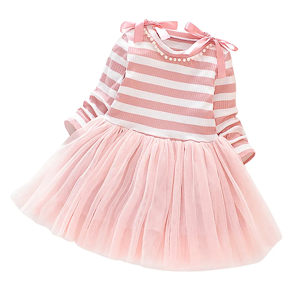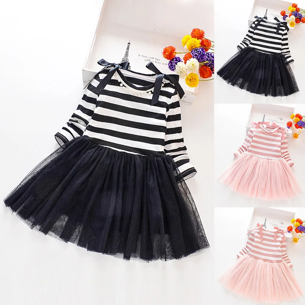 Платье для маленьких девочек Новое комбинированное газовое платье в полоску с длинными рукавами