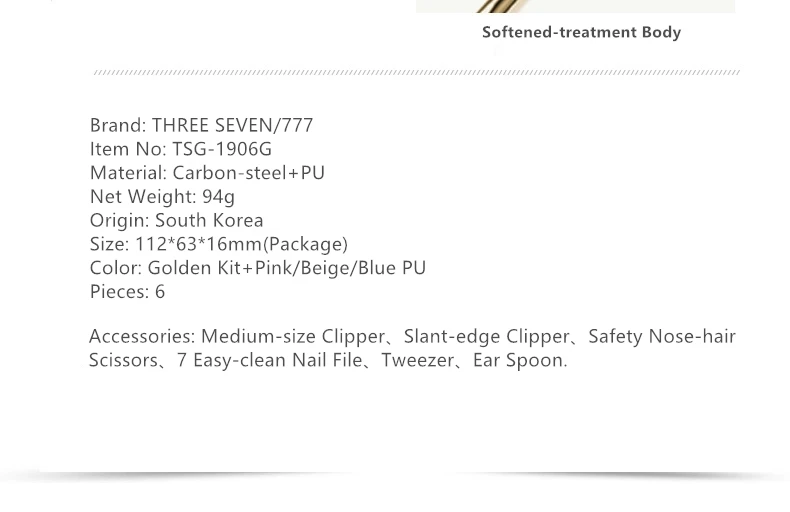 Три SEVEN/777 основана в 1975 году, которая является корейской компанией, которая в основном производит инструменты для ногтей красоты, с более чем 600 сотрудниками и более чем 50 кооперативными предприятиями. На внутреннем рынке приходится более 90%, на мировом рынке-более 50%, и ежегодно экспортируется в более чем 80 стран. 777-это профессиональное базовое предприятие с объемом экспорта $25 миллионов, а производственные мощности-не только первые в стране, но и в мире. Годовой объем производства кусачек для ногтей составляет более 80 миллионов и поставляется клиентам по всему миру. Более 80% механического оборудования, необходимого для производства, разработано и произведено независимо, с количеством патентов. Используя передовое профессиональное производственное оборудование, сочетающееся с профессиональным техническим руководством и проводя серию проверок качества, каждая функция продукта может соответствовать стандартам проектирования. Чтобы доставить красоту и здоровье в мире, 777 всегда в пути...