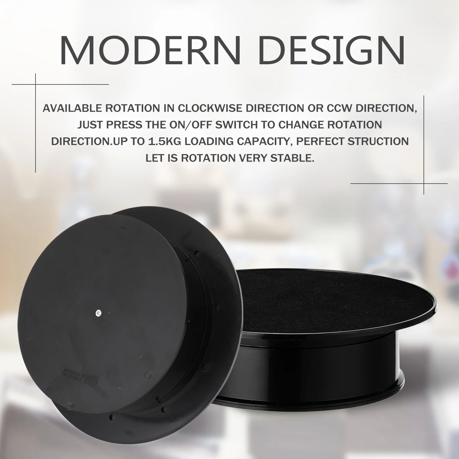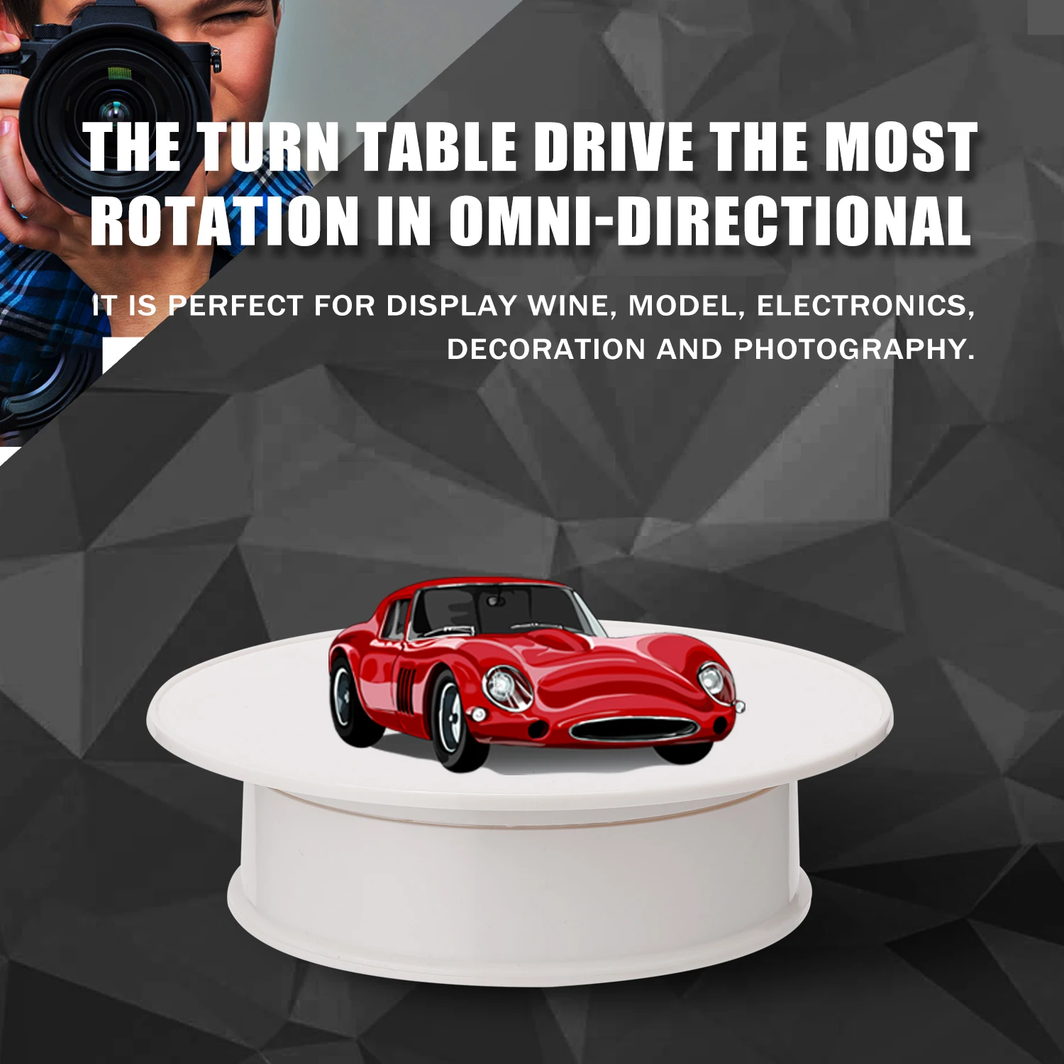 Поворотный стол является универсальным дисплеем, рекламной и прославленной подставкой, благодаря двойному вращению направления. Предназначен для дома и выставки, идеально подходит для демонстрации вина, модели, электроники, украшения и фотографии.