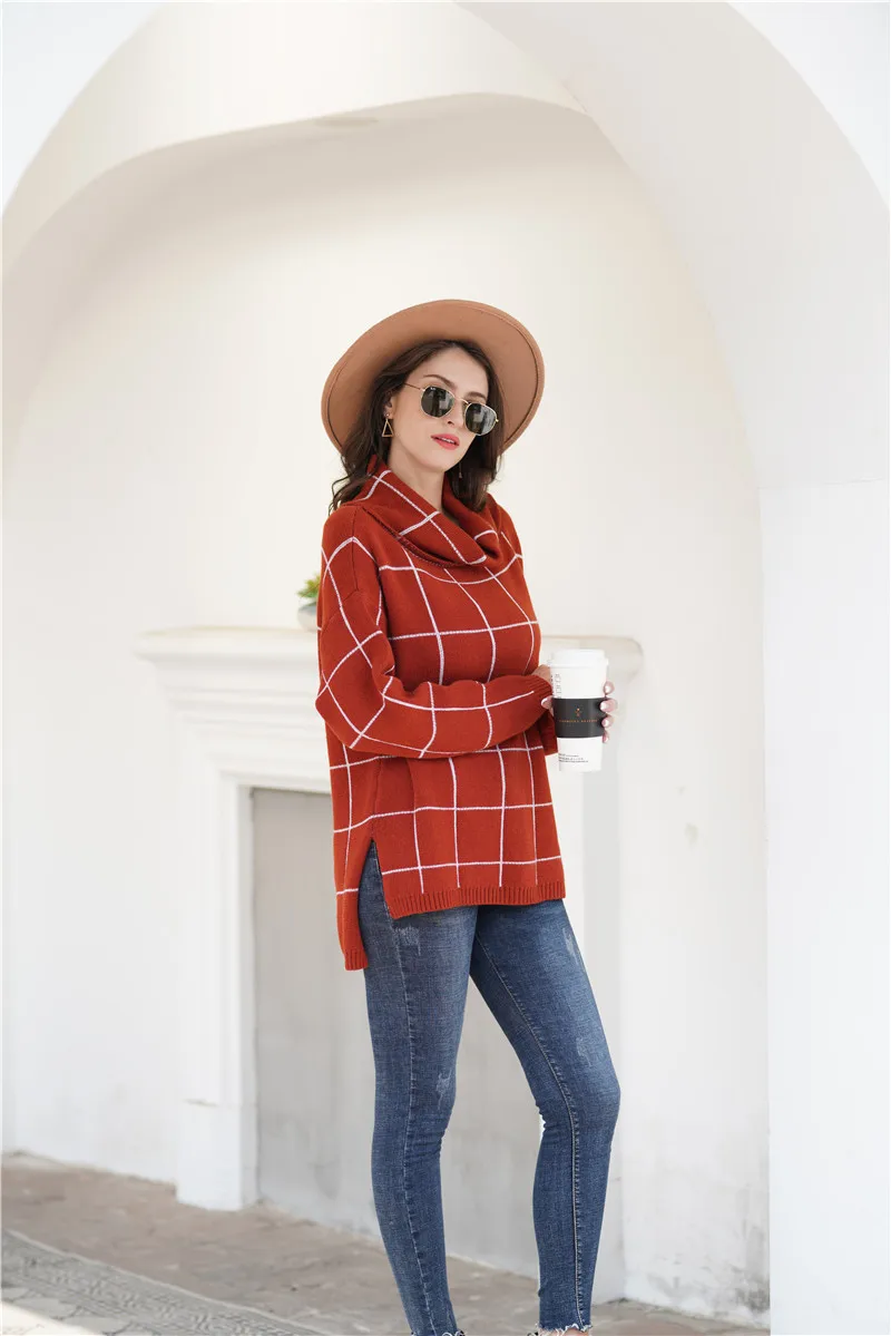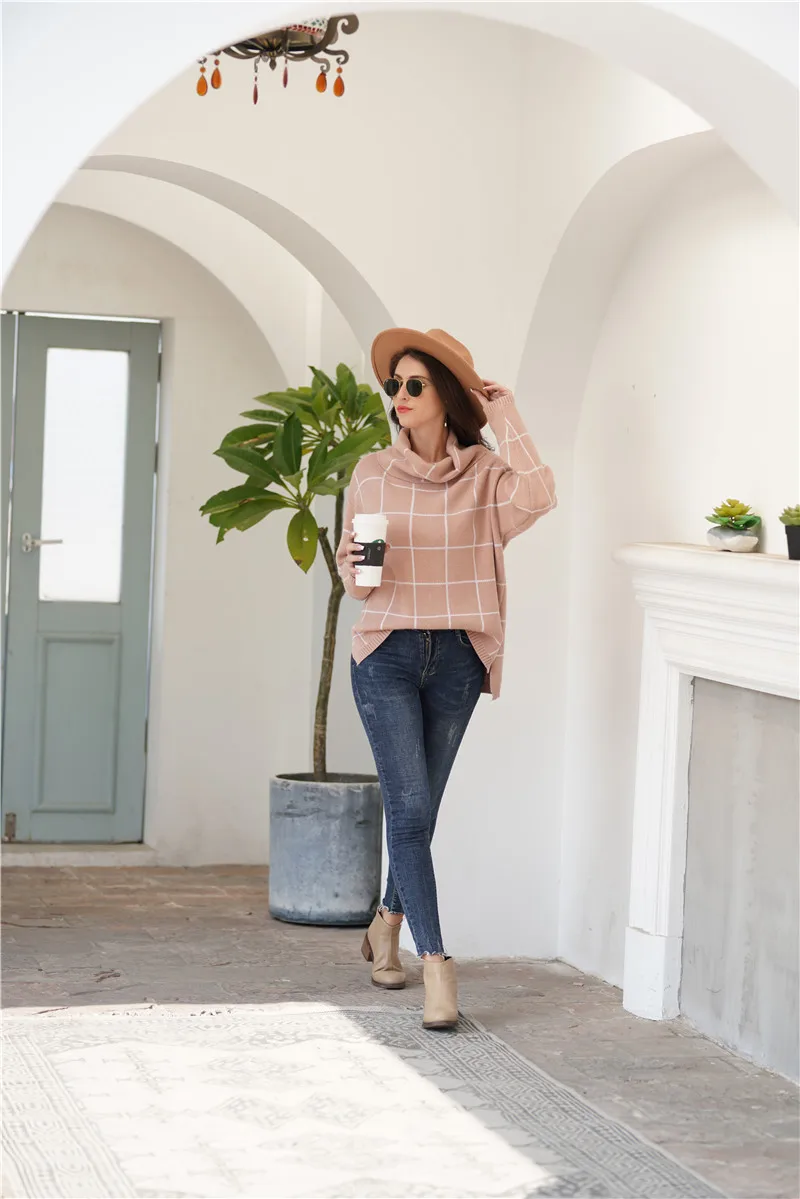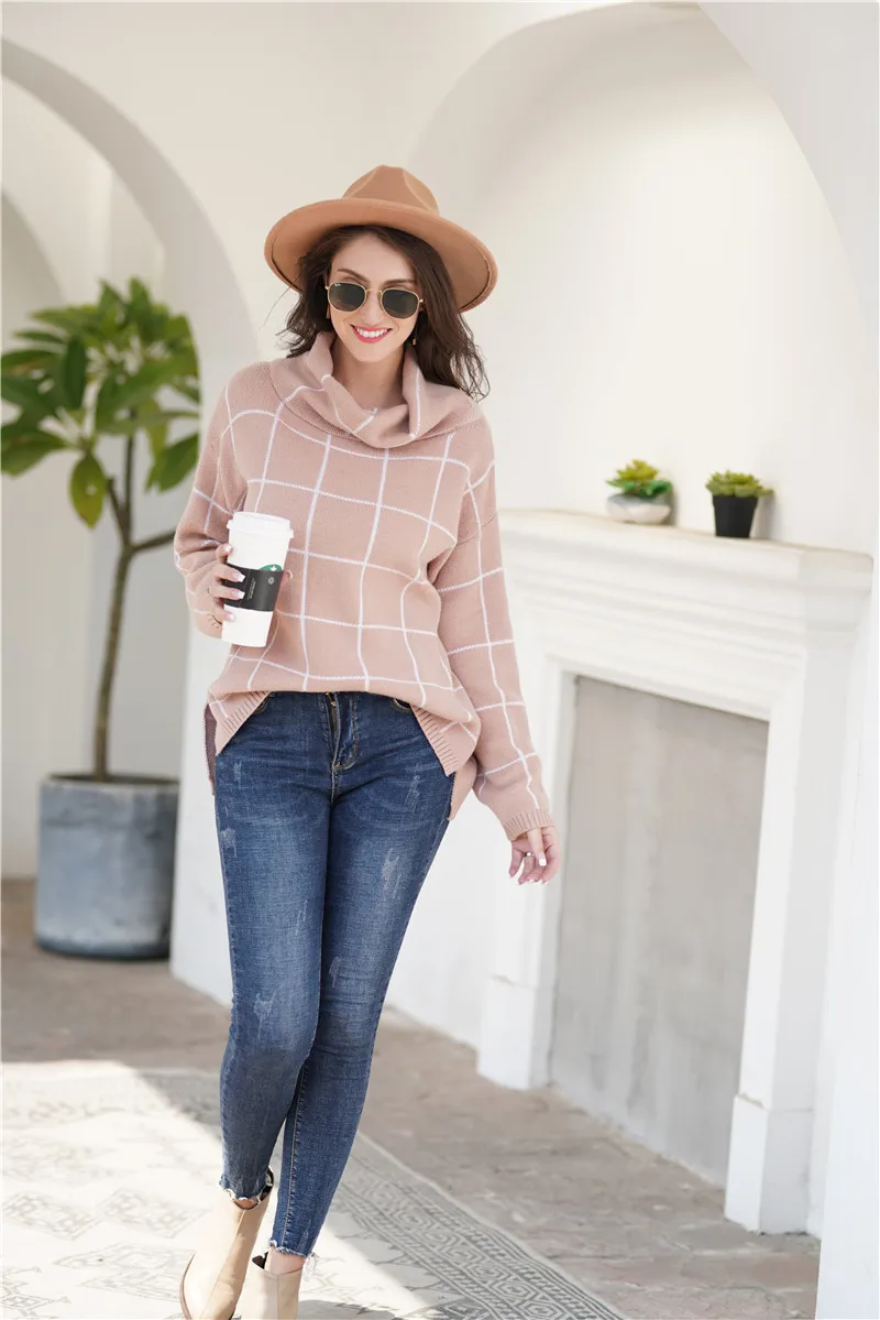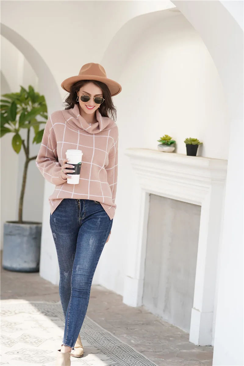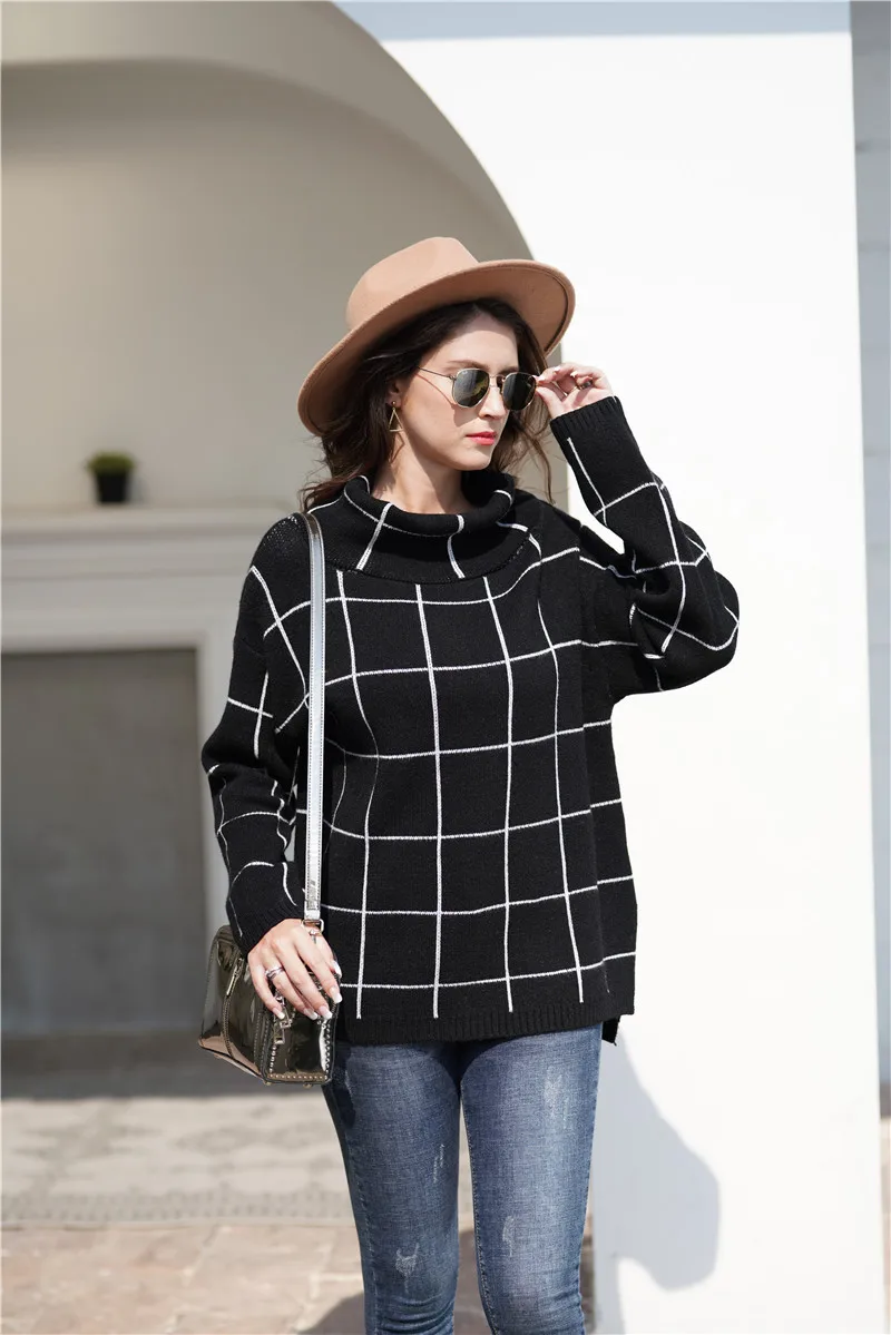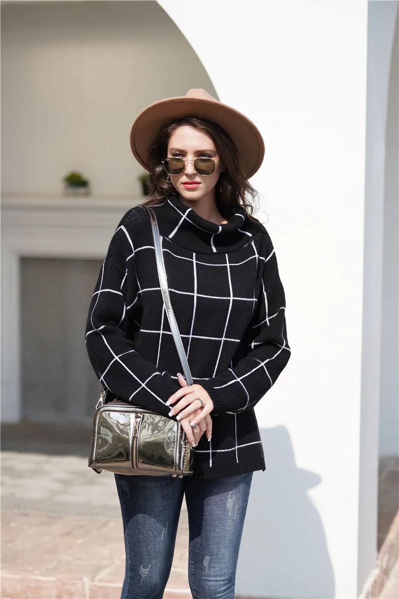 Aswinfon Checkered Turtleneck Sweater Women Loose Knitted Pullovers Autumn Winter Knit Sweater Pullover Long Sleeves Jumper Lady