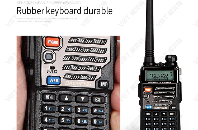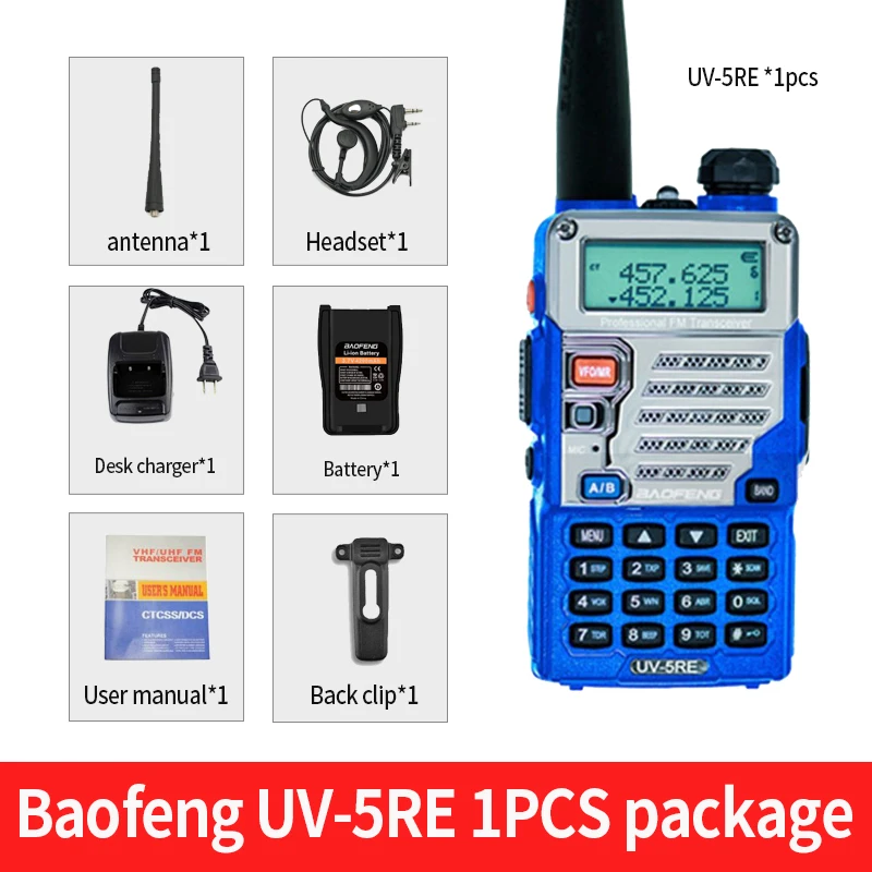 1. Диапазон частот: 136-174 / 400-520 МГц 2. Двухдиапазонный дисплей, двойной Freq. Дисплей, двойной режим ожидания 3. Выходная мощность: 4 /1 Вт 4. 128 каналов 50 CTCSS и 104 DCS 5. Встроенная функция VOX 6. 1750 Гц тон Brust 7. Fm-радио (65,0 МГц-108,0 МГц) 8. Светодиодный фонарик 9. Большой ЖК-дисплей 10. Высокая/низкая мощность RF переключается 11 25 кГц/12,5 кГц переключаемый 12. Аварийное оповещение 13. Оповещение о низком заряде батареи 14. Аккумулятор Saver 15. Таймер отключения времени 16. Блокировка клавиатуры 17. Канал монитора 18. Шаг канала: 2,5/5/6.25/10/12.5/25 кГц 19. Набор Роджера Характеристики: 65-108 МГц (только FM получение); Частотный диапазон: 136-174 МГц и 400-520 МГц (TX/RX) Номер канала: 128 Стабильность частоты: ± 2,5 ppm Рабочее Напряжение: 7,4 В постоянного тока Выходная мощность: 4 Вт/1 Вт (макс. 5 Вт) Размеры (Ш x В x Г): 100 х 52 х 32 мм Вес: 250 г (включая батарею, антенну)