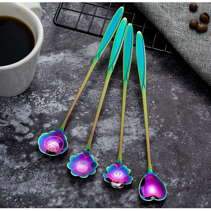 Material: stainless steel Size: about 18 * 2.6cm Color: black, multicolor Shape: heart, Cherryblossoms, Calliopsis, rose Weight: About 18g Package include : 1 pc Spoon