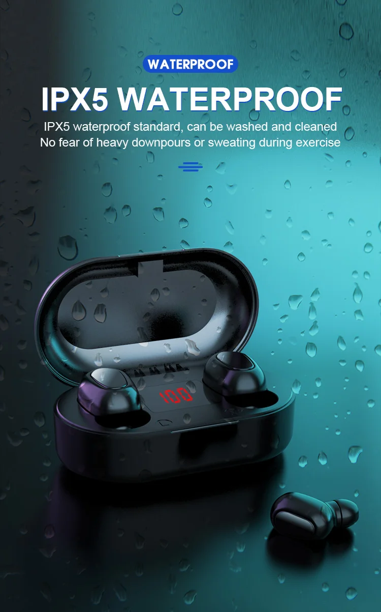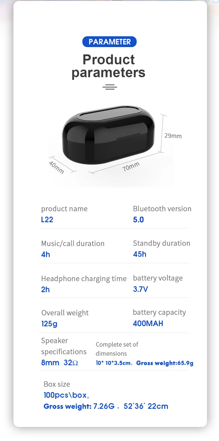 Описание продукта: 1. Чип: синий новости 2. Версия Bluetooth: 5,0 в 3. Материал: ABS + PCABS + покрытие + Пищевая силиконовая Ушная крышка 4. Эффективное расстояние: более 10 метров 5. Динамик: медное кольцо 8 мм 6. Батарея: гарнитура 55 мАч, зарядный чехол 400AMH 7. Время работы: 4-5 ч 8. Время работы в режиме ожидания: 120 ч 9. Время полной зарядки: около 0,5 часов 10. Цвет: белый, черный Посылка список: 1 * беспроводные наушники (с чехол для зарядки)