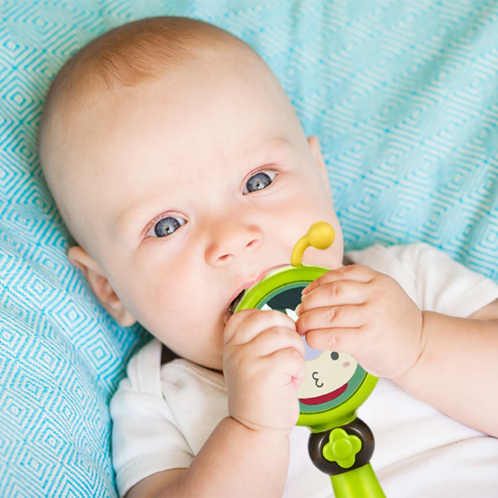 -Удобная ручка и мягкие, изогнутые края делают хватание и тряску безопасными и веселыми, повышая мелкую моторику.