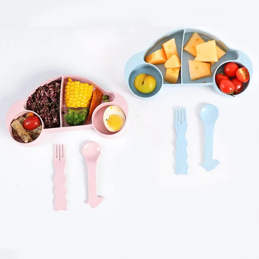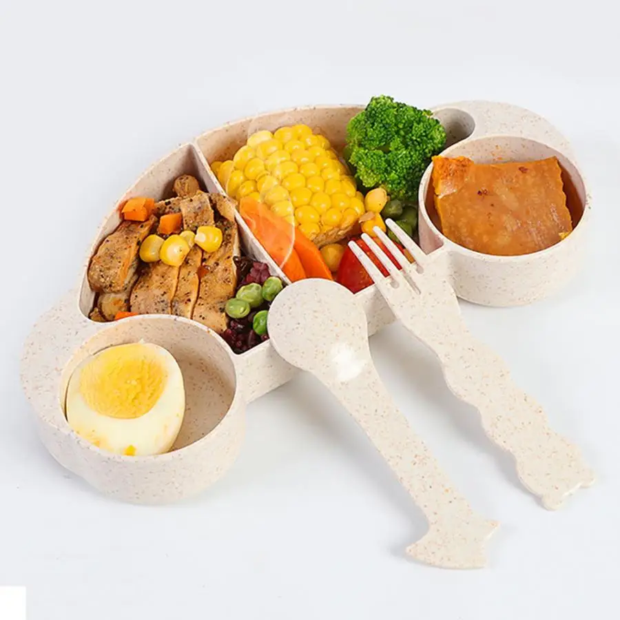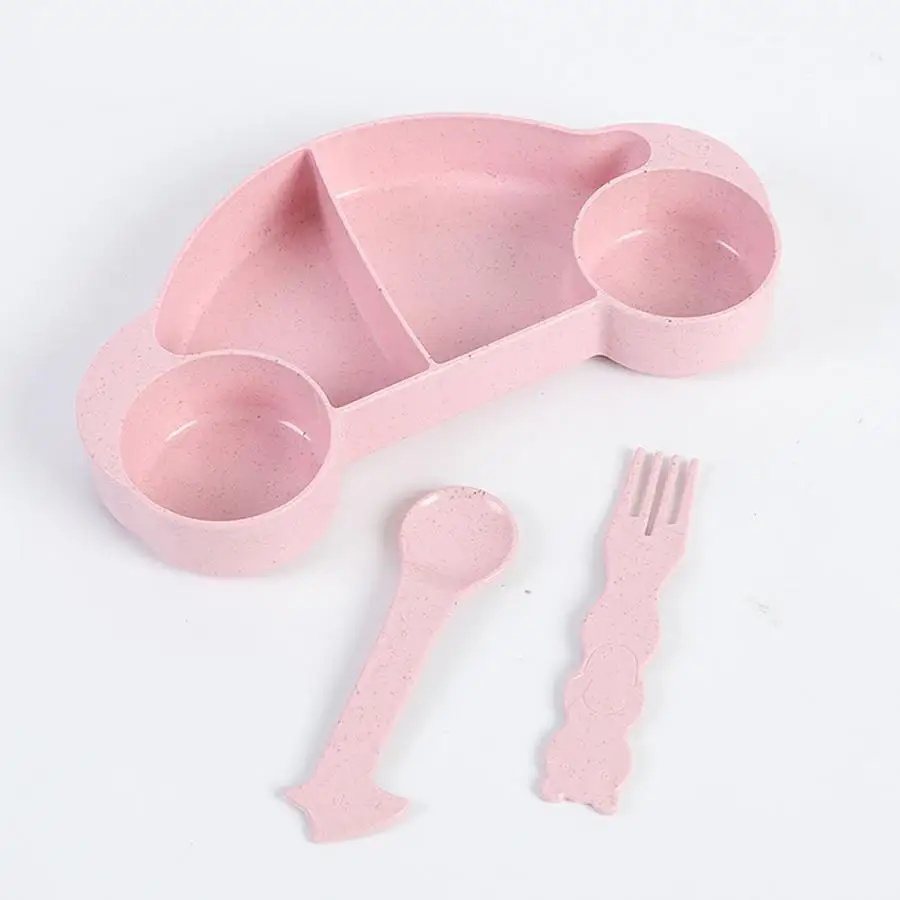 3PCS Wheat Straw Kids Cartoon Fork Spoon Fruit Bowl Plastic Bowl Tableware Set Baby Dishes Kids Dinner Plate Eating Dinnerware