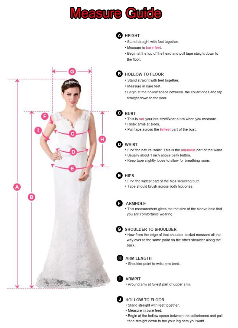 Индивидуальный сервис и срочный заказ доступны. Для обеспечения лучшей посадки, пожалуйста, проверьте нашу таблицу размеров перед размещением заказа. С наилучшими пожеланиями! Для платья на заказ, пожалуйста, заполните формат ниже и предложите нам при размещении заказа. Или свяжитесь с нами, мы всегда к вашим услугам. A. Высота = _ см или дюймы (естественная высота не включает вашу обувь) B. Полые до пола (без обуви) = _ см или дюймы C. Обхват груди = _ см или дюймы D. Талия = _ см или дюймы Е. Бедра. _ см или дюймы F. Пройма = _ см или дюймы (от верхней части головы до пола без обуви) G. Плечо до плеча = _ см или дюймы H. Длина руки _ см или дюймы I. Подмышка = _ (как показано на картинке, цвет или любой цвет на выбор, ознакомьтесь с нашей цветовой таблицей) J. Полые до пола = _ см или дюймы Вам нужно платье по последней дате поставки: DD _ мм _ YY _ Примечание: Если у вас есть какие-либо особые требования к платью, пожалуйста, скажите мне еще раз, когда вы посылаете мне измерения.