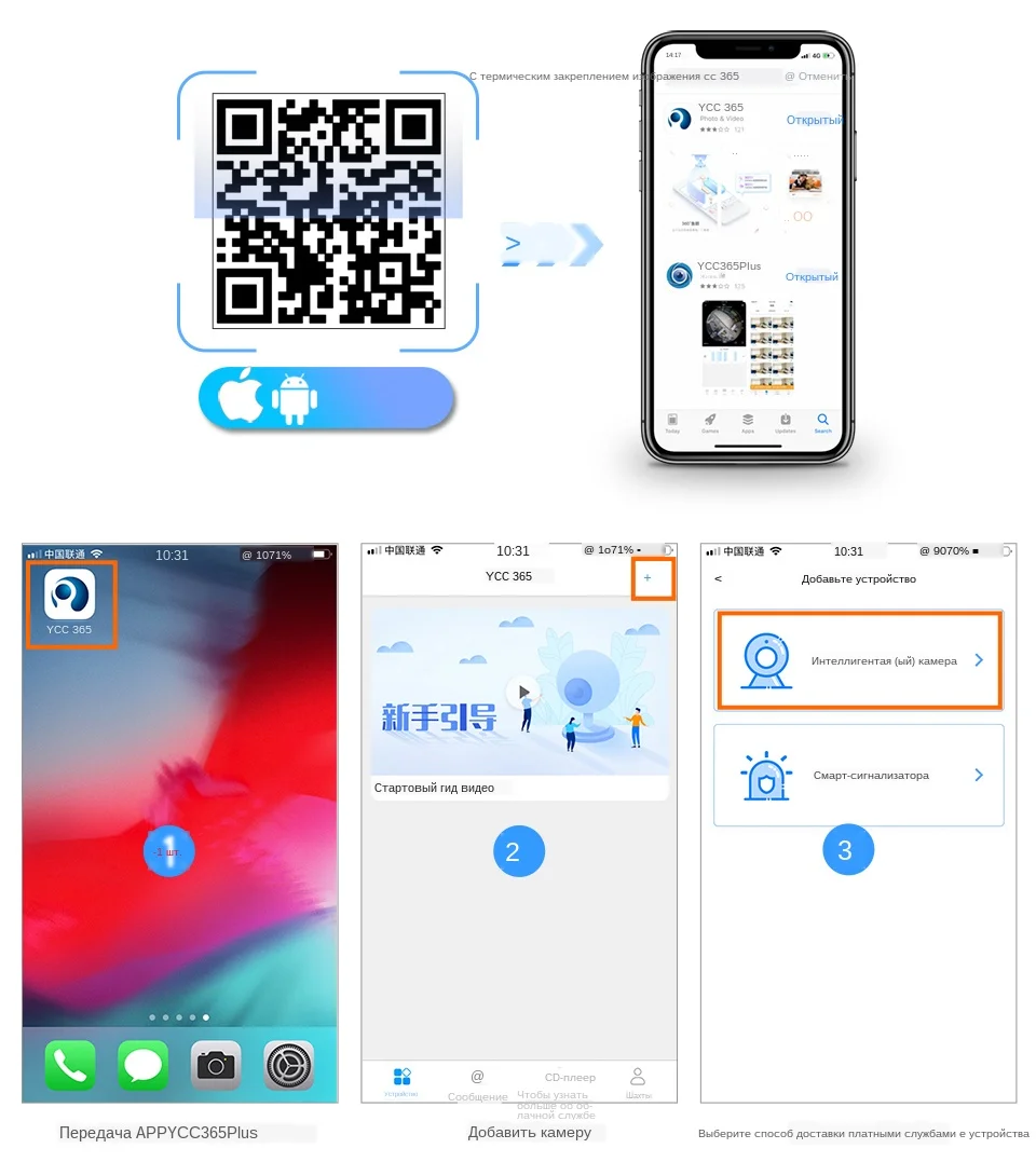 1. Доунагрузка приложение YCC365 Plus 2. Добавить камеру 3. Выберите интеллектуальную камеру 4. Устройство, добавляющее сканирование кода; 5. Отметьте кончики; 6. Введите пароль Wi-Fi; 7. Поместите qr-код лицом к камере; 8. Дождитесь подключения; 9. Получите прямой обзор.