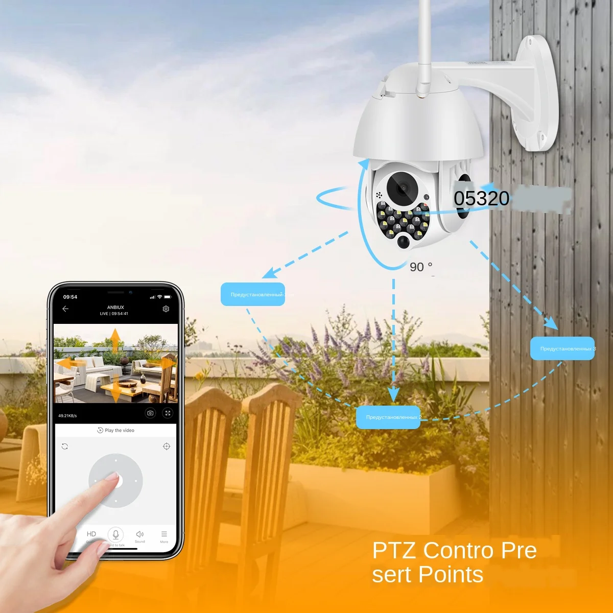 320 ° PTZ панорамирование/наклон вращение по вертикали 90 ° может контролировать угол поворота через приложение YCC365 Plus. Он может настроить максимум 8 предустановленных точек