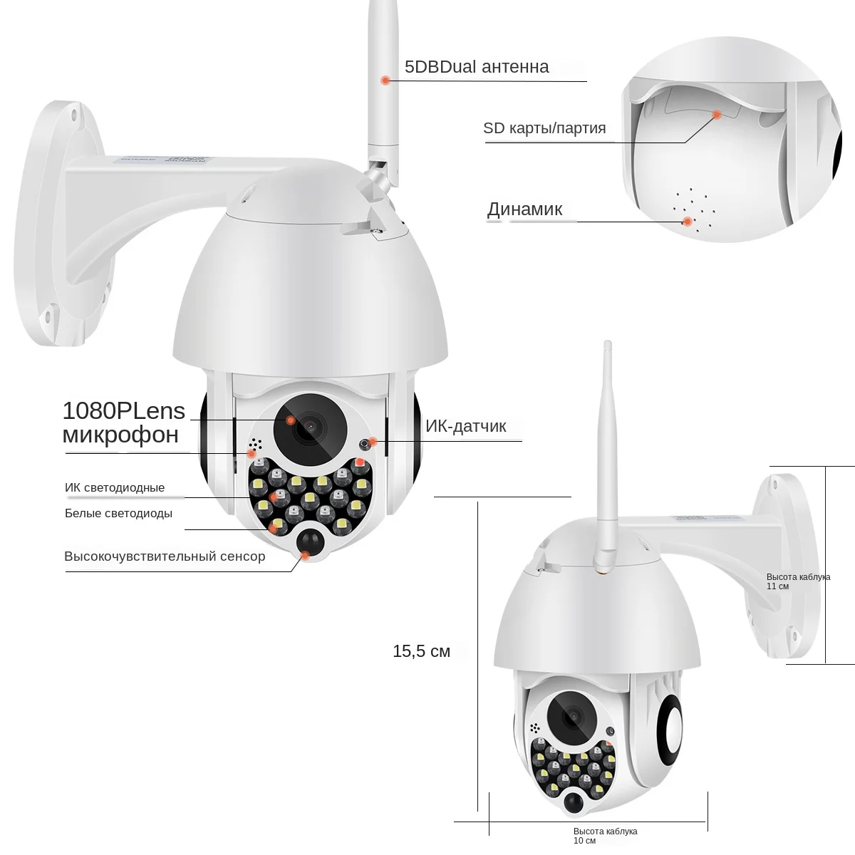 Выходное напряжение: 12 в пост. Тока/2 а Приложение: YCC365 чип: GK пиксель: 2 млн Разрешение: 1920*1080P Датчик изображения: 1/3 "cmos-сенсор стандарт сжатия: H.264 Формат видео: 1080P Объектив: 3,6 мм wifi: Поддержка 2,4g класс водонепроницаемости: IP66 угол поворота: горизонтальный 0-320 °, вертикальный 0-90 ° количество белых огней: 9 Количество инфракрасных огней: 7 красных и синих предупреждающих огней: 2 sd-накопителя: Поддержка карт памяти 8-128G (не входит в комплект) Облачное хранилище: Поддержка облачного хранения (необходимо оплатить дополнительную плату) скорость вращения: по горизонтали 0 ° ~ 320 °/по вертикали 0 ° ~ 90 ° эффект ночного видения: инфракрасное ночное видение, полноцветное ночное видение, умное ночное видение