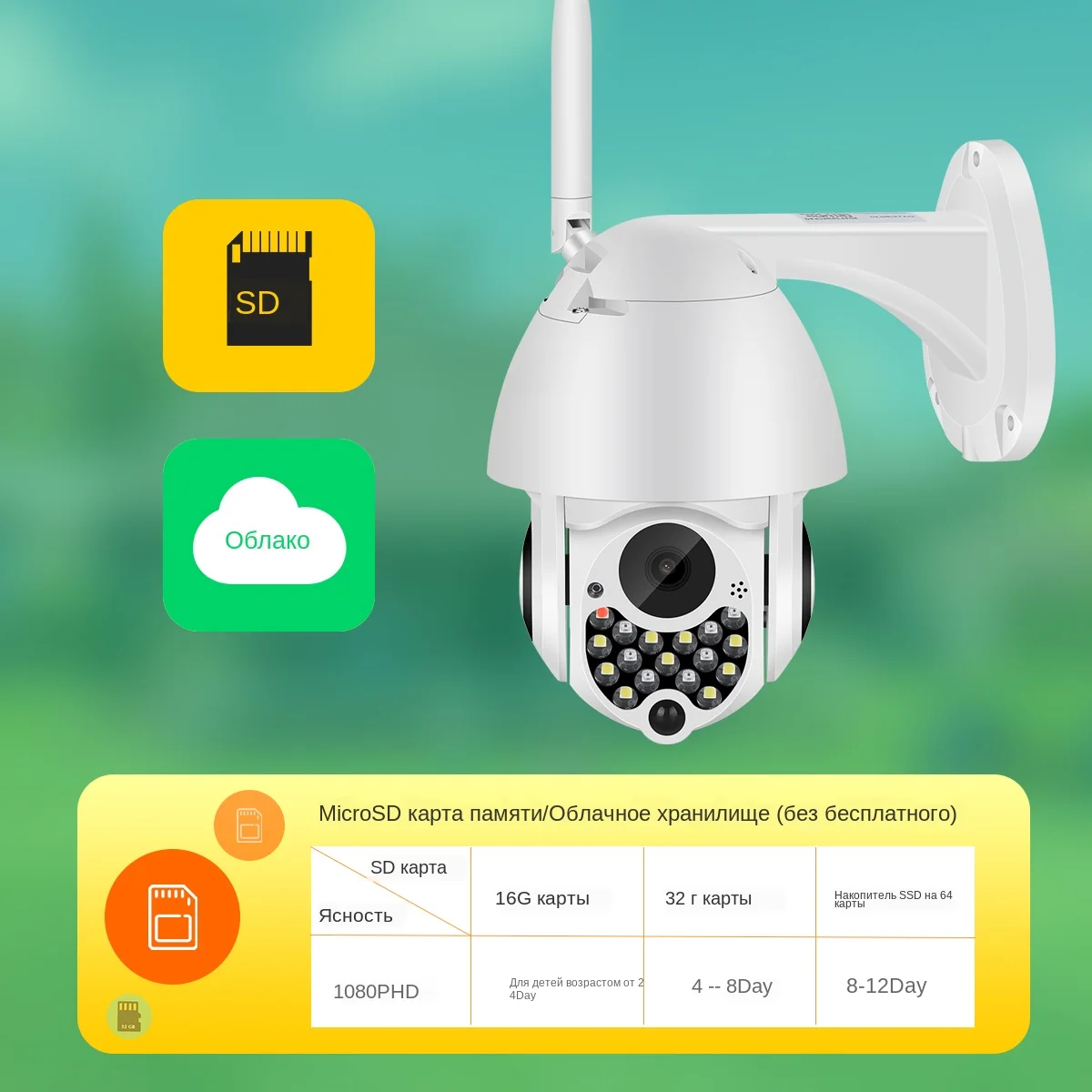 Поддерживает до 128 ГБ tf-карту и предоставляет услуги облачного хранения (необходимо оплатить дополнительные расходы), вы можете выбрать любой или оба для хранения ваших записей и избежать риска потери отснятого материала с карты.