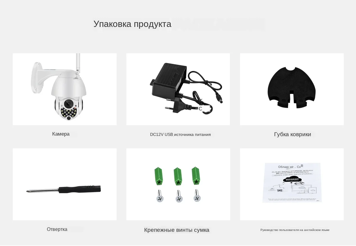 1 * ip-камера 1 * Руководство пользователя 1 * Адаптер питания 1 * Винт упаковка 1 * отвертка