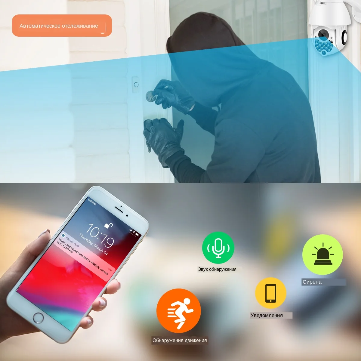 Когда кто-то ворвается в область съемки, обнаружение движения и отправка push-уведомления на вашем мобильный телефон.