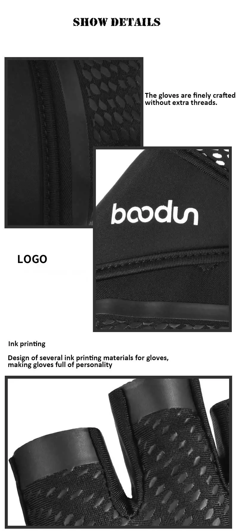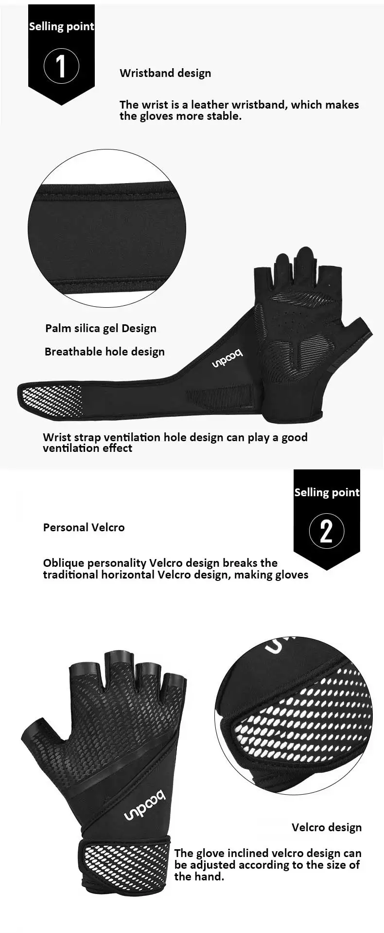 1. Дизайн браслета Запястье представляет собой кожаный браслет, который делает перчатки более стабильными. 2. Силиконовый дизайн на ладони Дышащая конструкция с отверстиями Вентиляционное отверстие с ремешком на запястье может играть хороший эффект вентиляции 3. Персональная липучка Косой индивидуальный дизайн на липучке ломает традиционный горизонтальный дизайн на липучке, делая перчатки более персонализированными 4. Дизайн на липучке Дизайн перчаток с наклонной липучкой можно регулировать в соответствии с размером руки.
