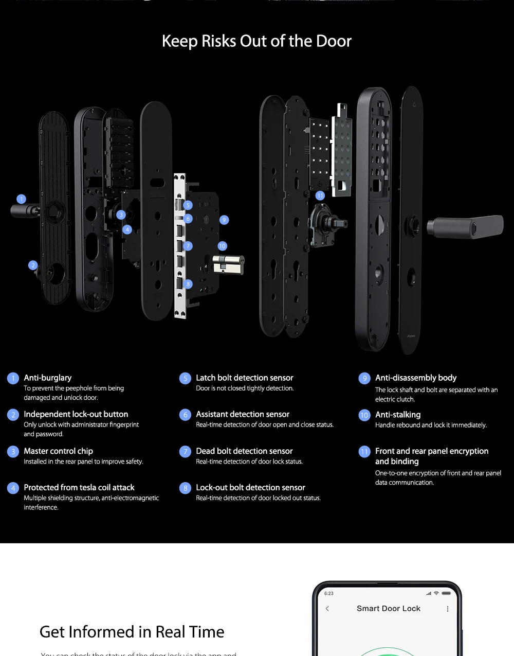 Aqara N100 расположен в семейном месте, который является чрезвычайно безопасным интеллектуальным дверным замком. Он поддерживает отпечаток пальца, пароль, временный пароль, механический ключ, NFC, мобильный телефон Bluetooth и другие методы разблокировки. Протокол связи-Bluetooth 5,0, который поддерживает HomeKit. Приложение может проверить состояние дверного замка и запись открытия замка в любое время и в любом месте. Когда дверной замок дает ненормальный сигнал тревоги, сигнал тревоги будет автоматически нажимать на ваш телефон, чтобы защитить безопасность дома днем и ночью.