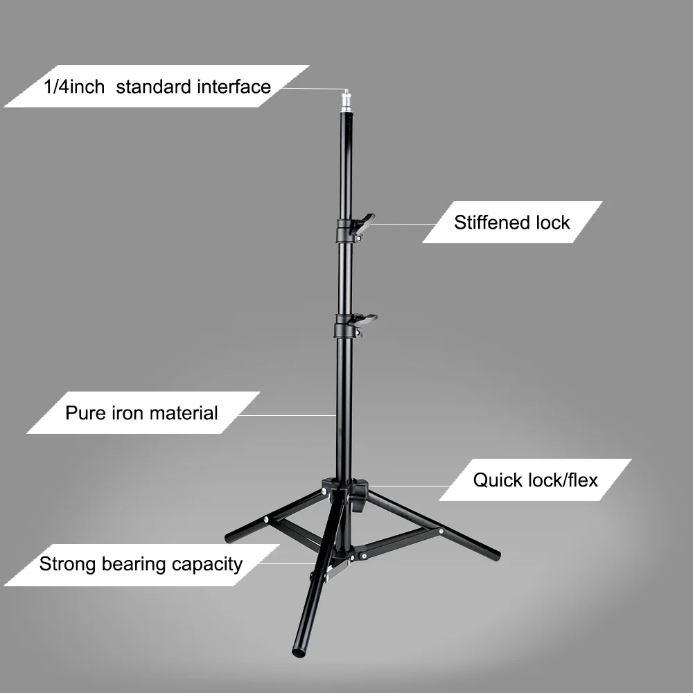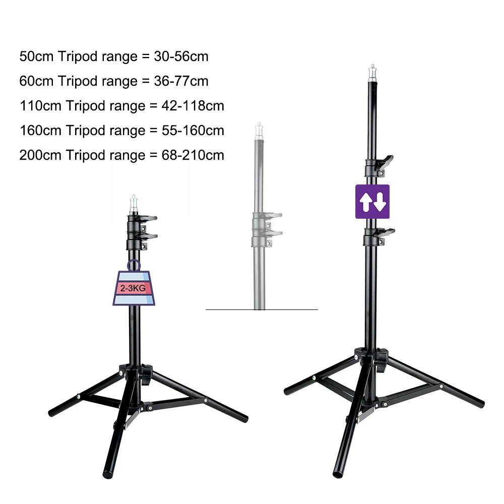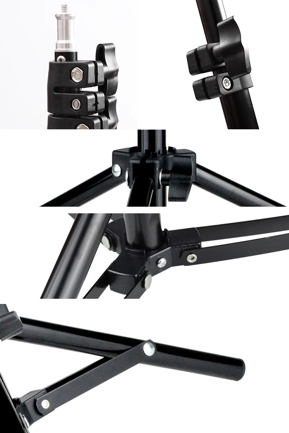 Легкие подставки с регулируемой высотой (50-210 см); Идеально подходят для фотостудий или фотосессий на месте 1/4 дюймов винтовой наконечник; Может вмещать стандартные огни, стробоскопы и фоны Изготовлен из прочного, но легкого металла с гладкой черной отделкой Максимальная грузоподъемность 5 кг (каждый); Складывается до размера 31-66 см для удобства переноски и компактного хранения