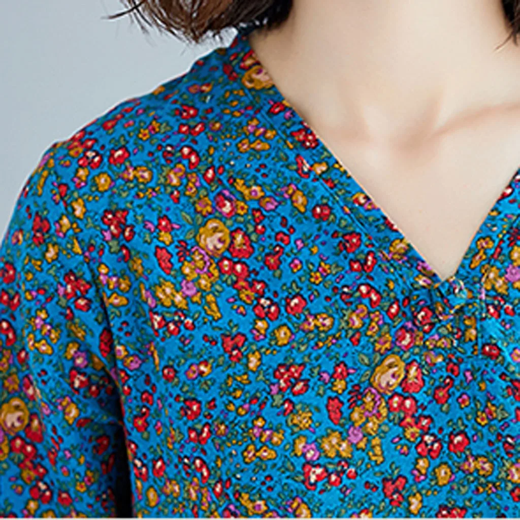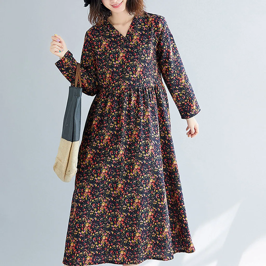 Fashion Women Long-Sleeved Literary High-Waist Printed Plus Size Loose Dress