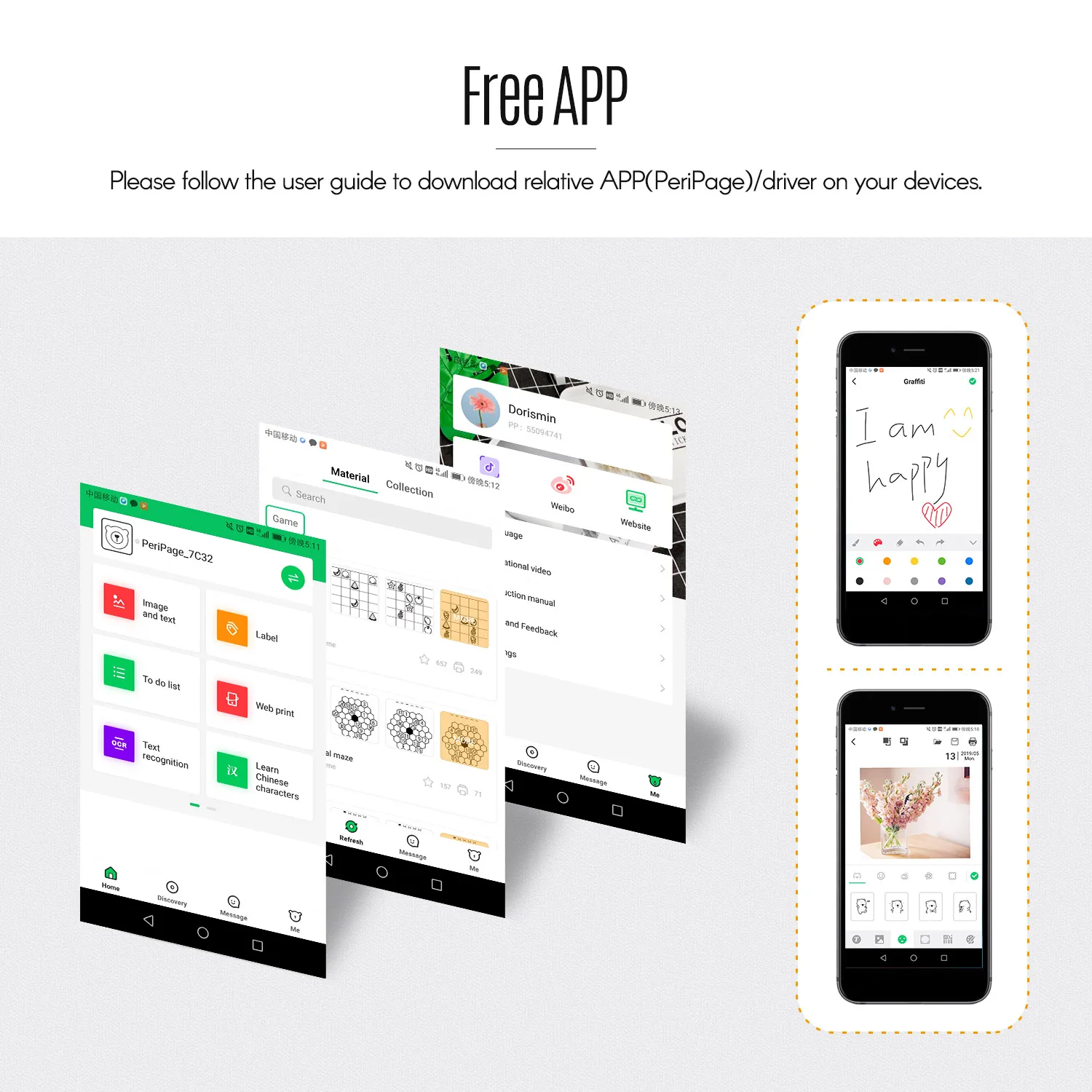 【Способ подключения:Поддержка беспроводного BT 4,0, подключенного к смартфону и usb-кабелю, подключенному к ПК. Следуйте инструкциям пользователя, чтобы загрузить относительное приложение (PeriPage)/драйвер на ваших устройствах. Совместимо с системой Windows, Android и iOS.