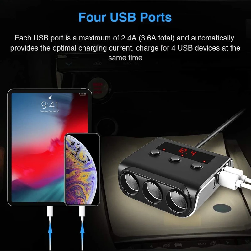 [LED Voltage Indicator] The LED indicates real time voltage to monitor the car battery. [3 independent switches and 1 main power switch] Start charging your devices with the on/off switch. It is no longer necessary to connect and disconnect the cable.