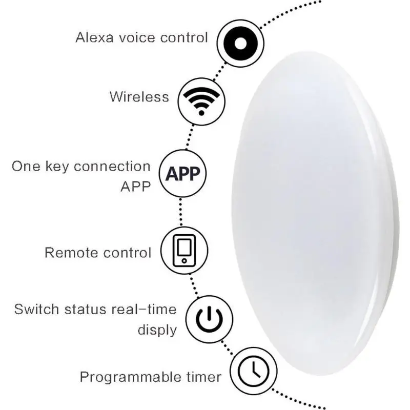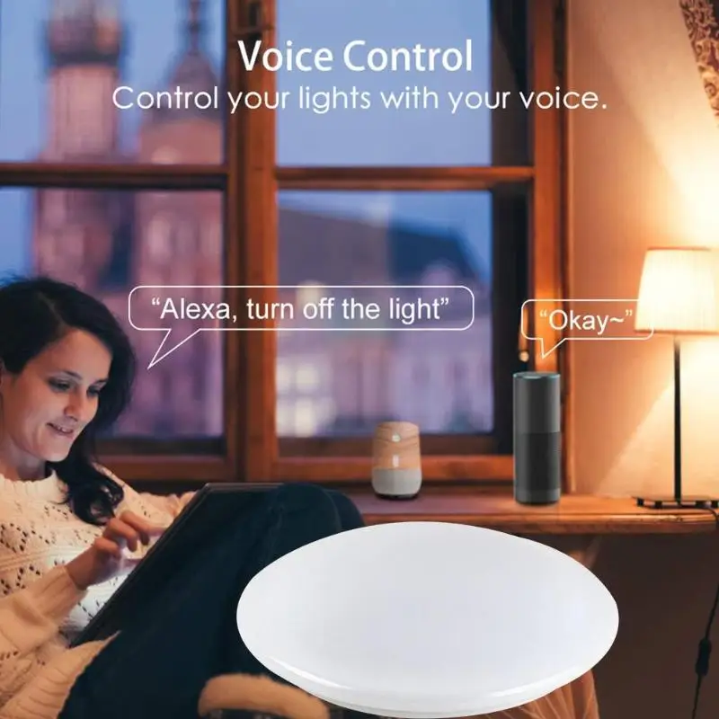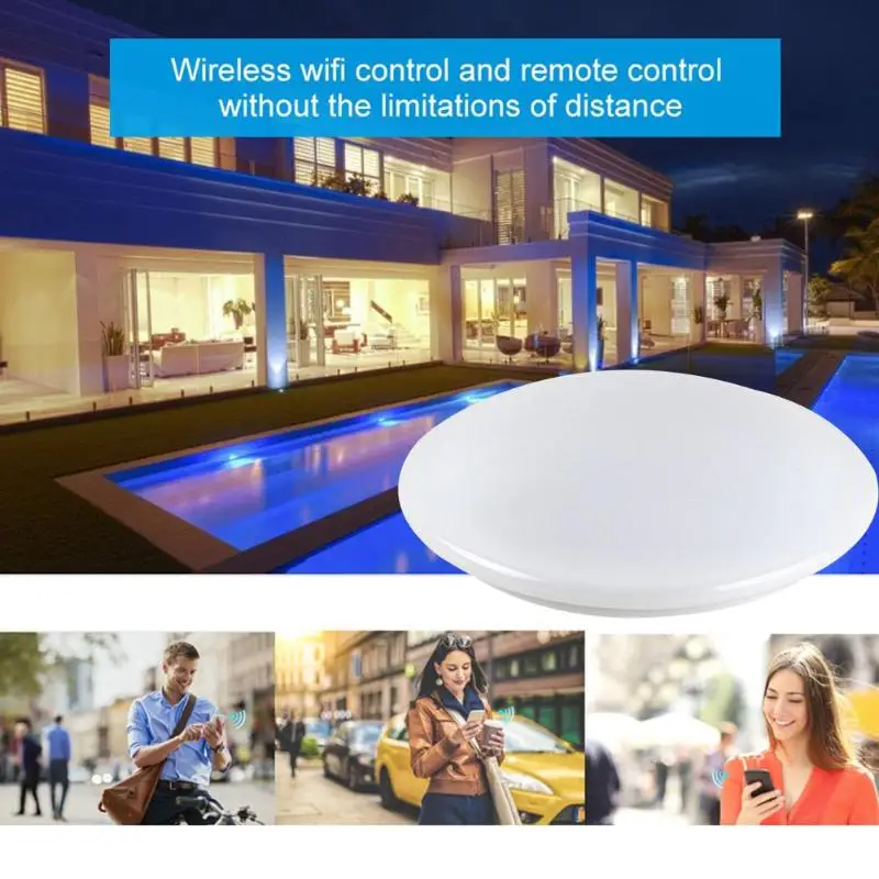 Беспроводное управление Wi-Fi, сверхдальний пульт дистанционного управления. Плавное затемнение, таймер, переключатель задержки. Подключите Tmall, Google home, Amazon Alexa. APPLE IFTTT и другие аудио. Alibaba cloud intelligence: Совместимость с Tmall Genie, поддержка нескольких языков, дистанционное управление мобильным приложением, синхронизация, затемнение. Групповое управление и одно управление, функция памяти, голосовое управление. Групповое управление и индивидуальный контроль. Характеристики: Вт: 48 Вт Материал: алюминий, акрил Светильник Цвет: белый светильник, теплый светильник Входное напряжение: AC85-265V Мощность: 48 Вт WW + CW Беспроводной Тип: Wi-Fi 2,4 ГГц Стандарт беспроводной связи: IEEE 802.11b/g/n Размер изделия: 400 мм/15,75" Размер посылка: 400*400*100 мм/15,75*15,75*3,94'' Цвет изделия: белый Срок службы: ≥ 30000 ч Вес посылка: 990 г Примечания: 1. Возможны отклонения в 1-3 см вследствие измерений вручную. 2. Из-за различных настроек монитора и светильник эффект, фактический цвет элемента может быть s светильник ly отличается от цвета, представленного на снимках. Спасибо! 1 X Руководство пользователя