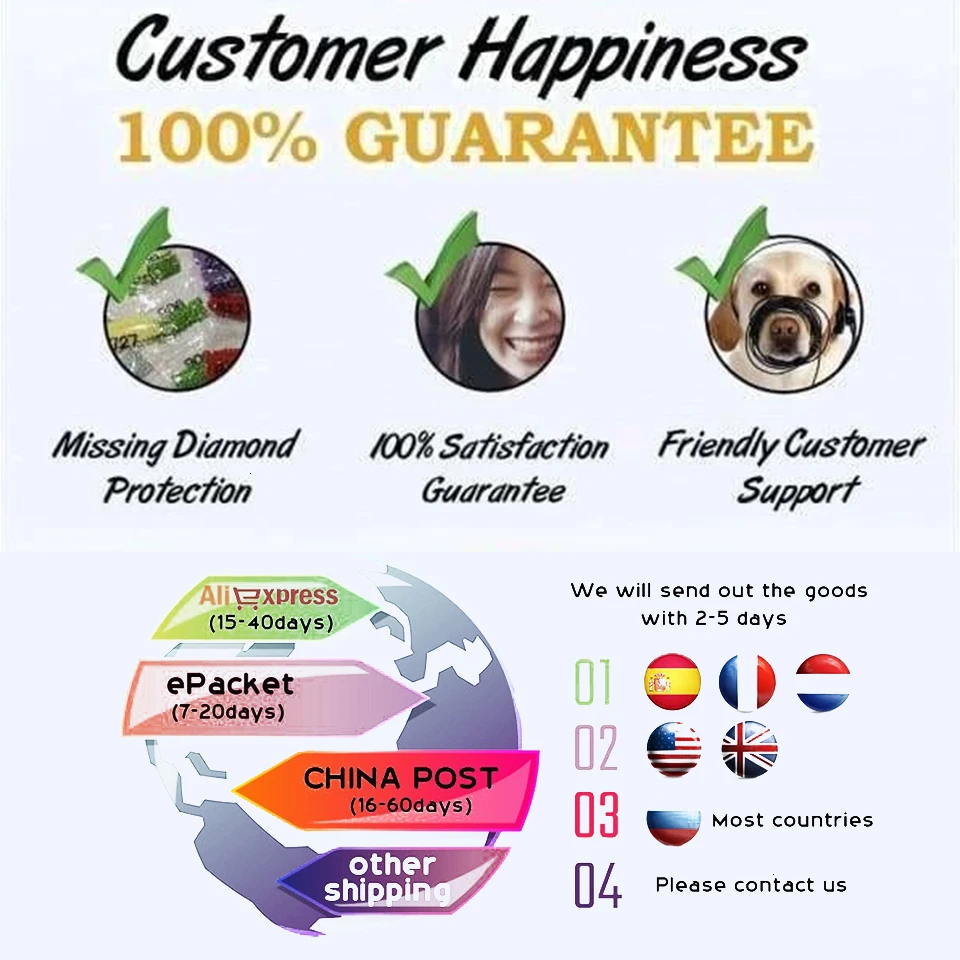 Все товары в нашем магазине используют высококачественные алмазы из смолы и отказываются от использования Алмазов низкого качества. Количество алмазов составляет 130%. В этом магазине вы можете воспользоваться услугами по переработке алмазов, чтобы больше не беспокоиться о нехватке алмазов. Если у вас нет алмазов, пожалуйста, свяжитесь с нами вовремя, и мы отправим вам недостающие алмазы бесплатно.