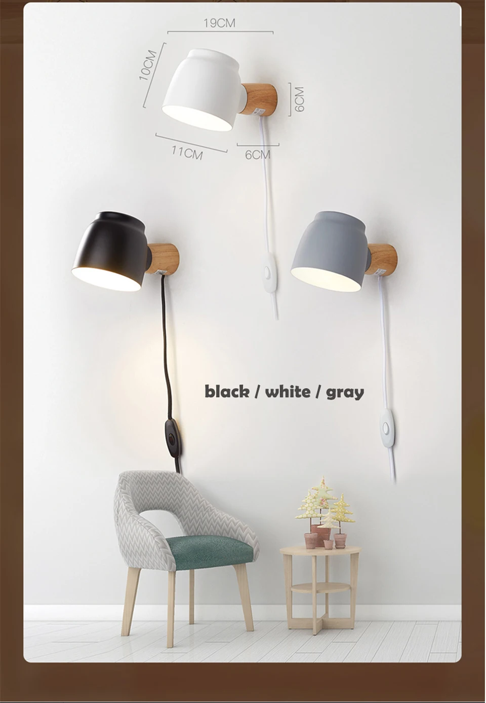 Настенный светильник для спальни, лампа для чтения, вращающаяся на 360 ° с выключателем, вставляемая в открытую линию, матовая железная лампа, абажур из массива дерева, столб лампы E14