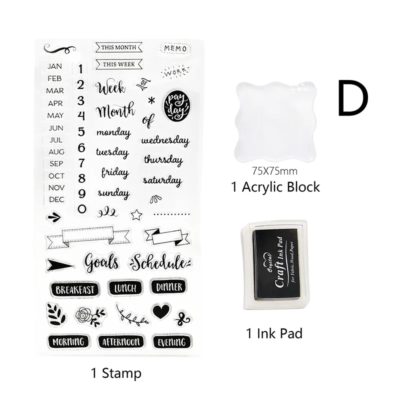 Название: прозрачный штамп Размер штампа: 105 мм x 205 мм Тип товара: прозрачный штамп Пол: унисекс A: 1 штамп B: 1 штамп C: 1 штамп + 1 акриловый блок (75х75мм) + 1 чернильный блок (черный) D: 1 штамп + 1 акриловый блок (75х75мм) + 1 чернильный блок (черный) E: 2 Штамп + 1 акриловый блок (75х75мм) + 1 чернильный блок (черный) F: 2 штампа + 3 акриловых блока (100x100 мм 75x75 мм 50x50 мм) + 11 чернильных колодок (все цвета) G: 2 штампа + 3 акриловых блока (100x100 мм 75x75 мм 50x50 мм) + 1 чернильный блок (черный) H: 3 акриловых блока (100x100 мм 75x75 мм 50x50 мм) + 11 чернильных колодок (все цвета) Три простых шага для использования ваших новых марок! 1. Просто снимите штамп с прозрачного листа и поместите его на прозрачный акриловый монтажный блок. Клеи не требуются, так как штампы цепляются за блоки. 2. Нанесите чернила на штамп. 3. Поместите изображение на нужную поверхность и плотно нажмите вниз.